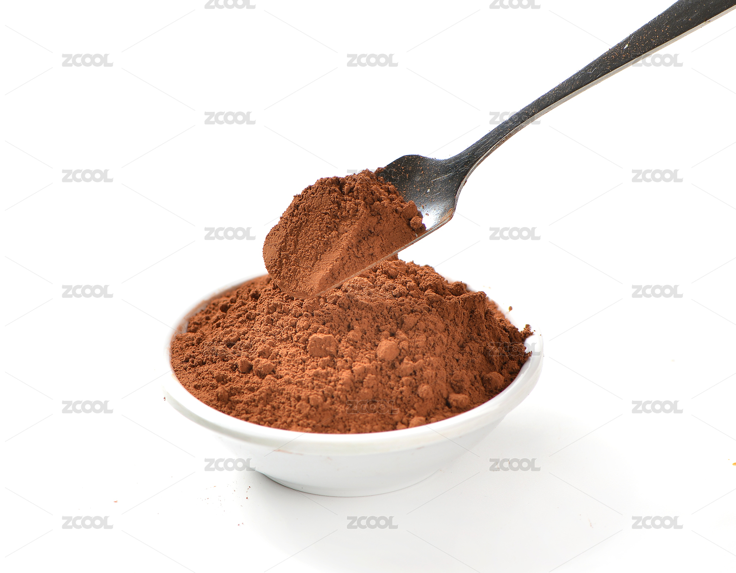 一堆巧克力粉和勺子上挖着巧克力粉