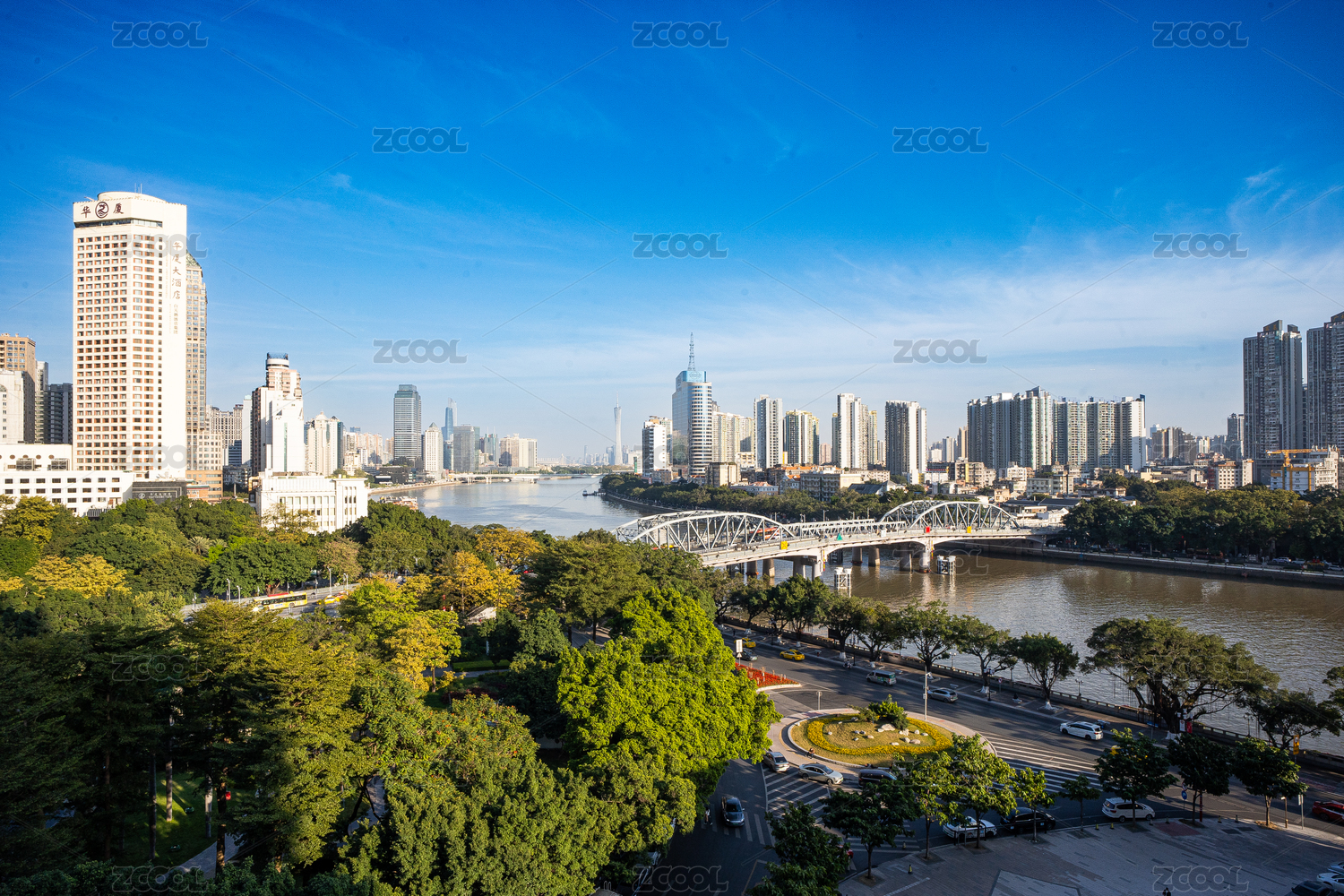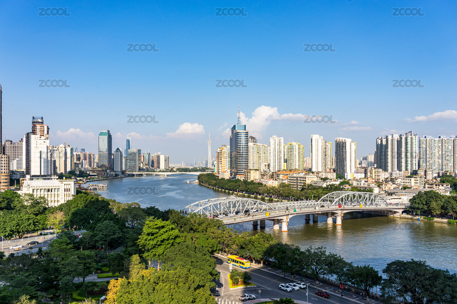 俯瞰蓝天白云下的海珠桥和珠江,还有远处的