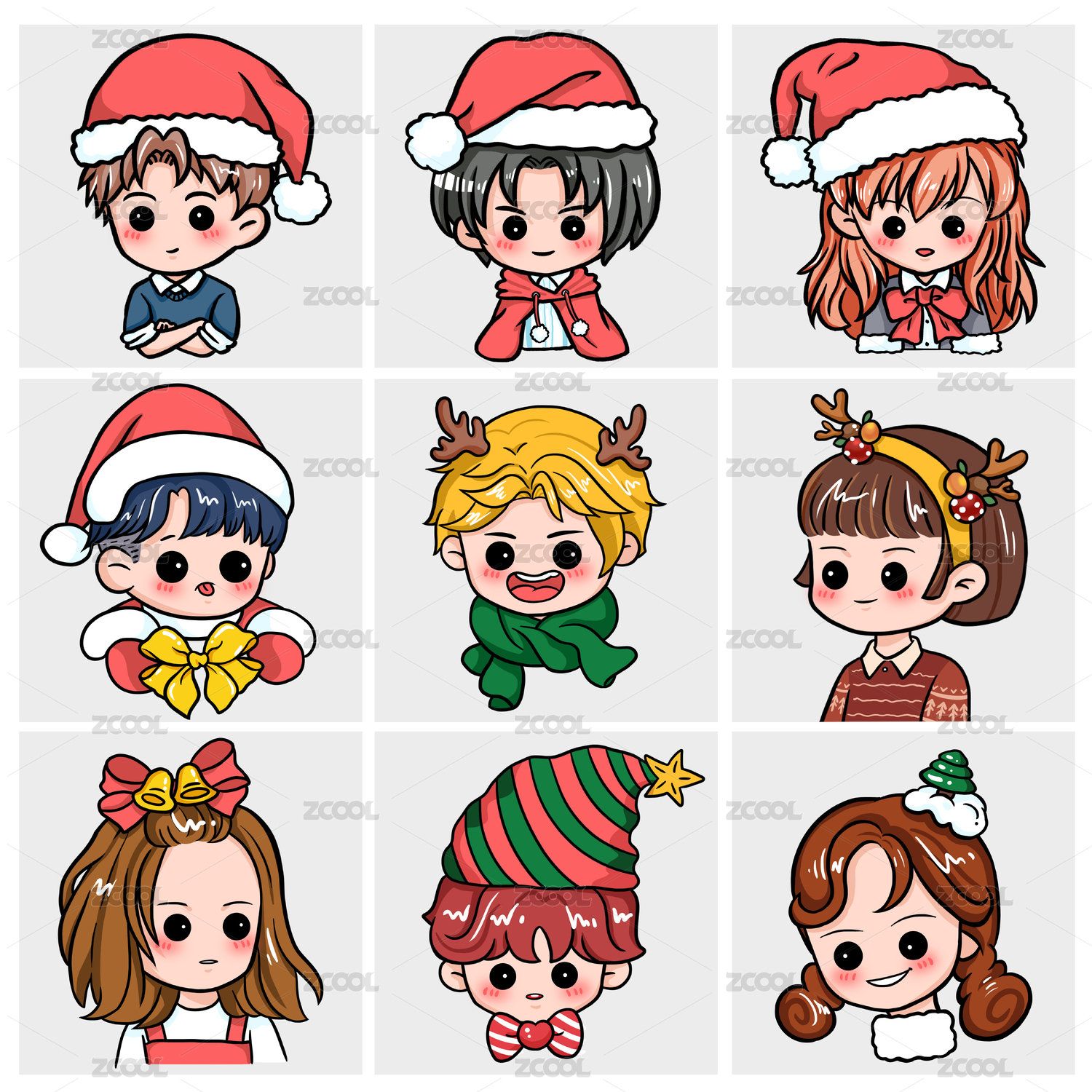 九宫格圣诞节可爱男女人物卡通头像