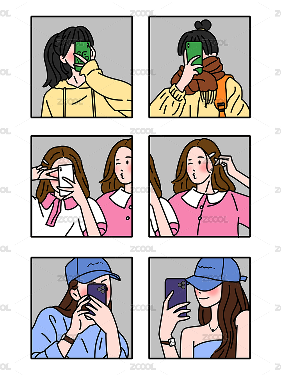 六个可爱卡通头像拿手机拍照自拍女生简笔画