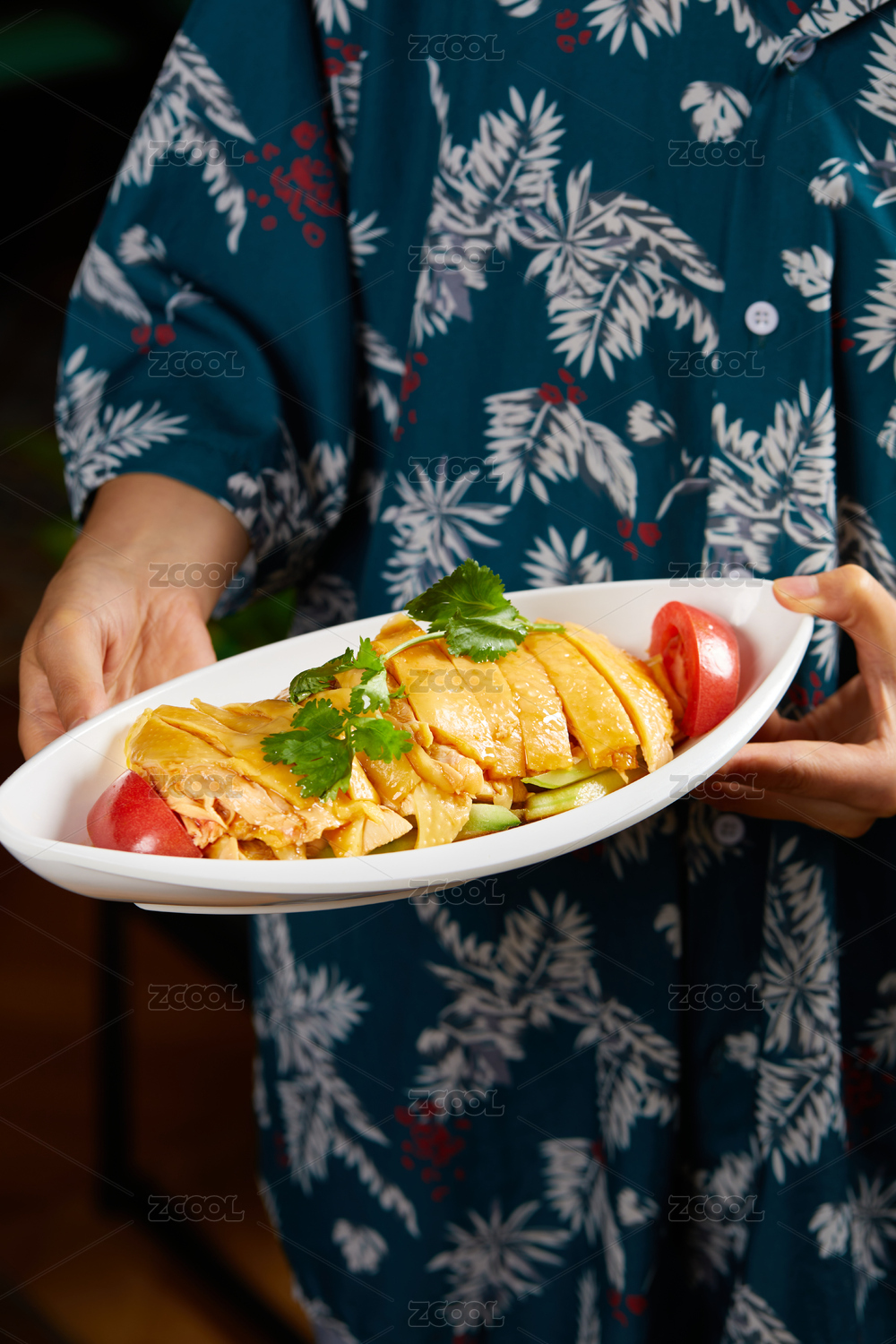 黑色桌面上的盘子,盘子里面的海南鸡