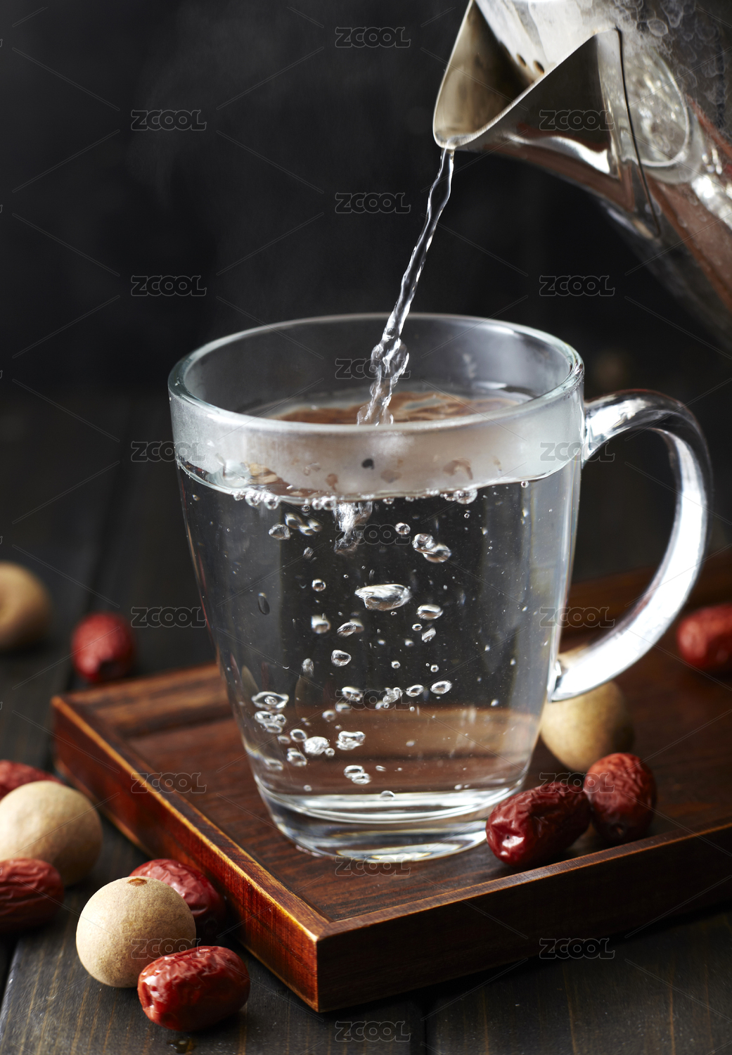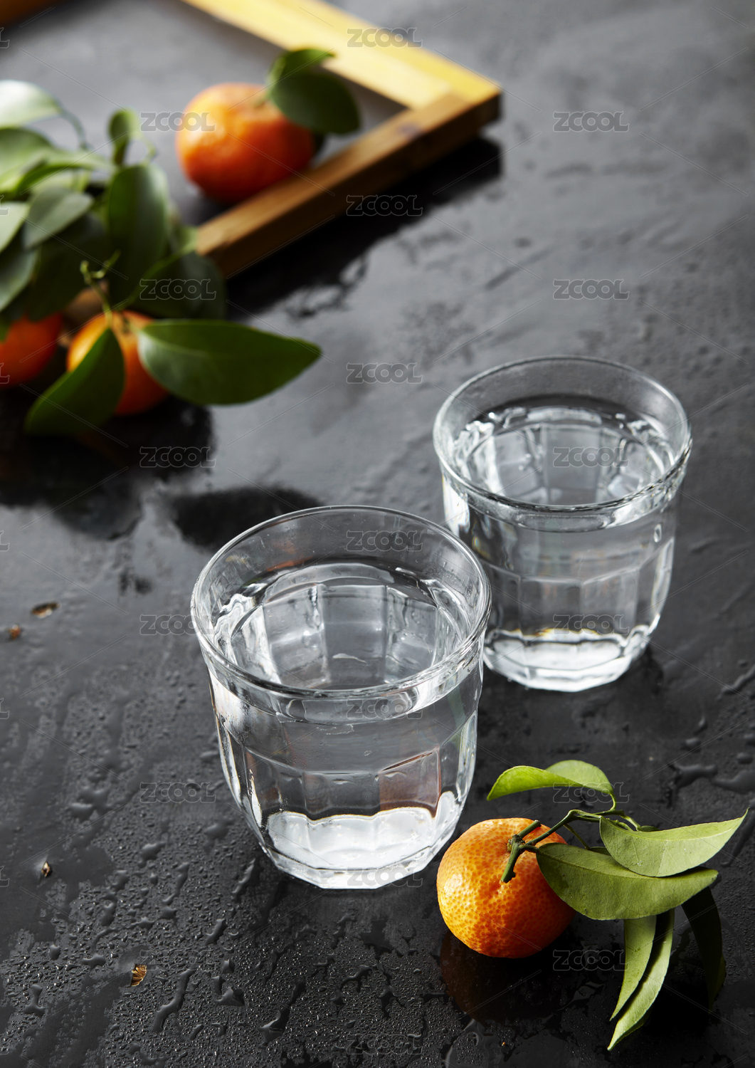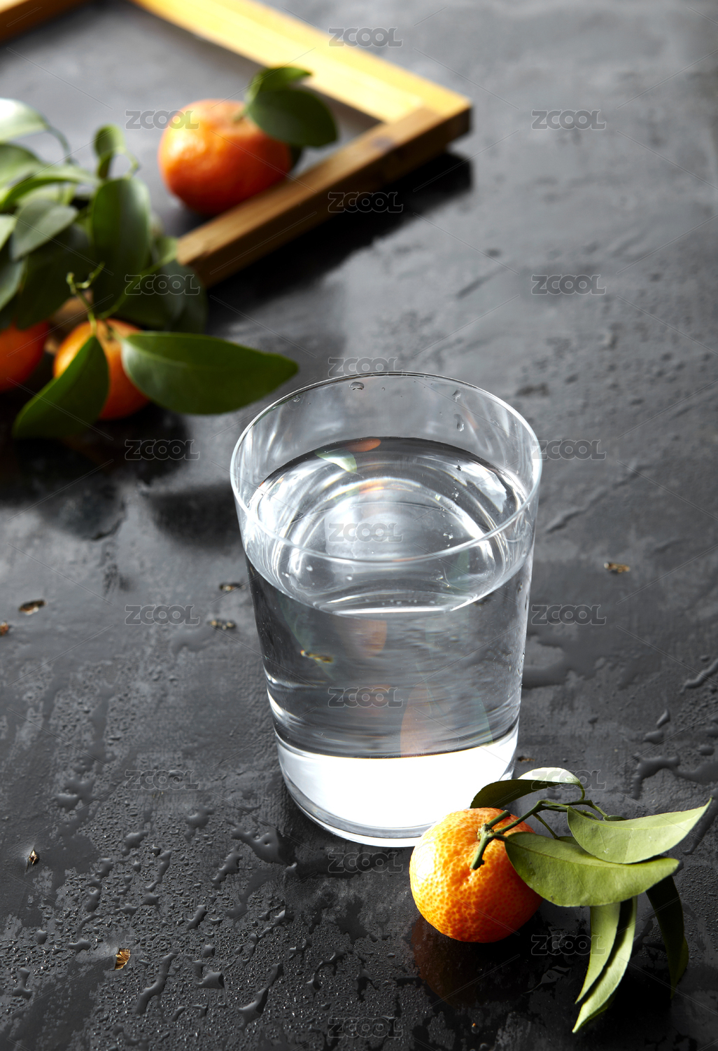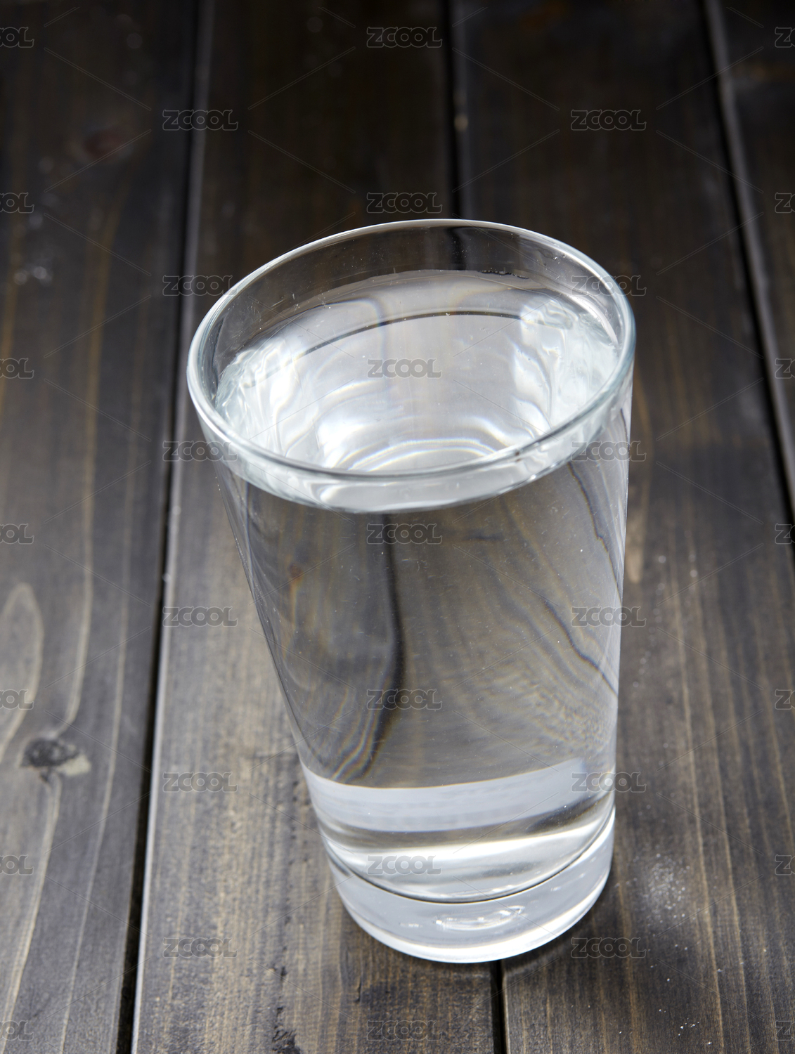装满清水的玻璃杯,在深色木纹背景