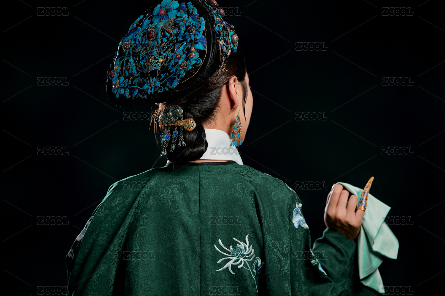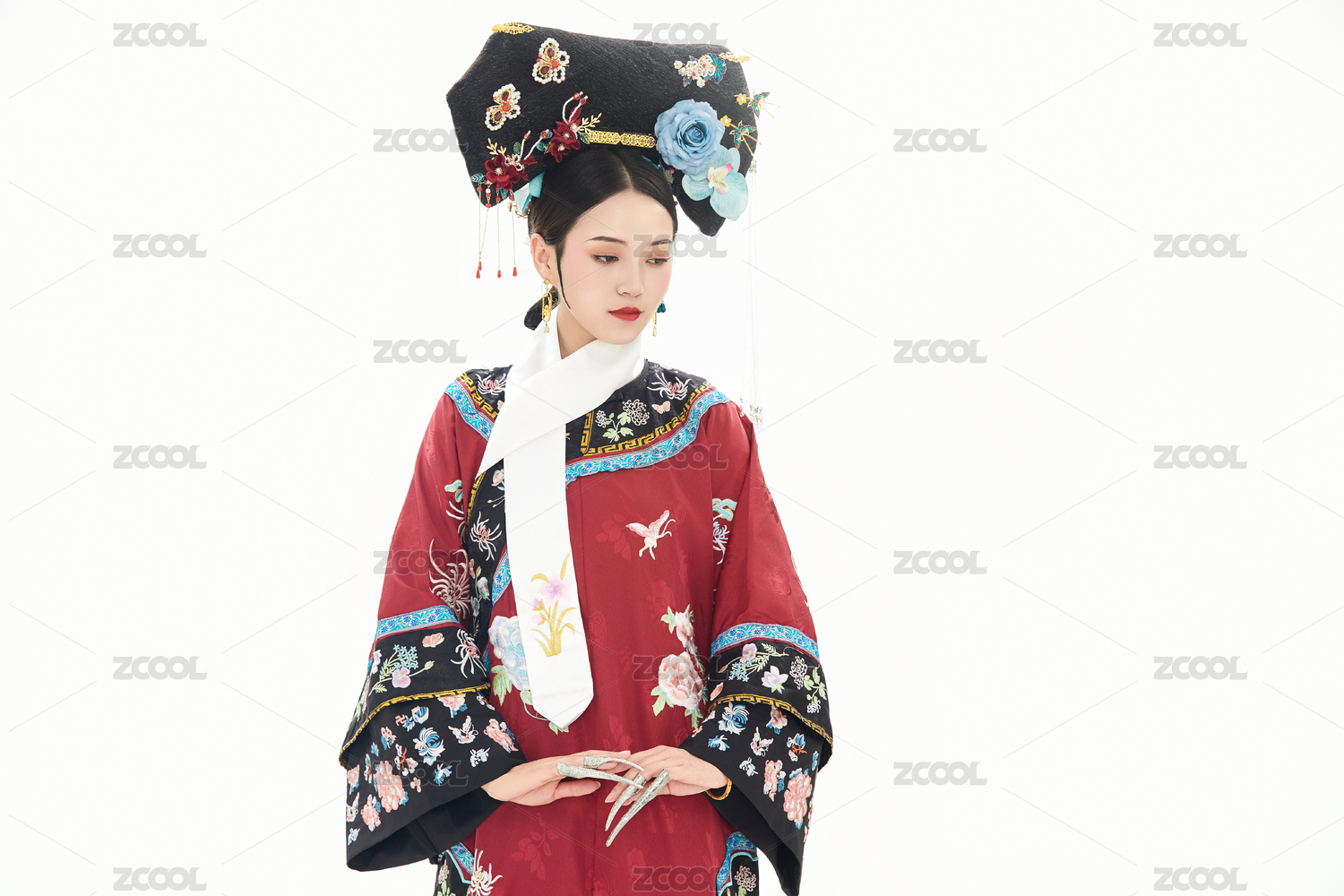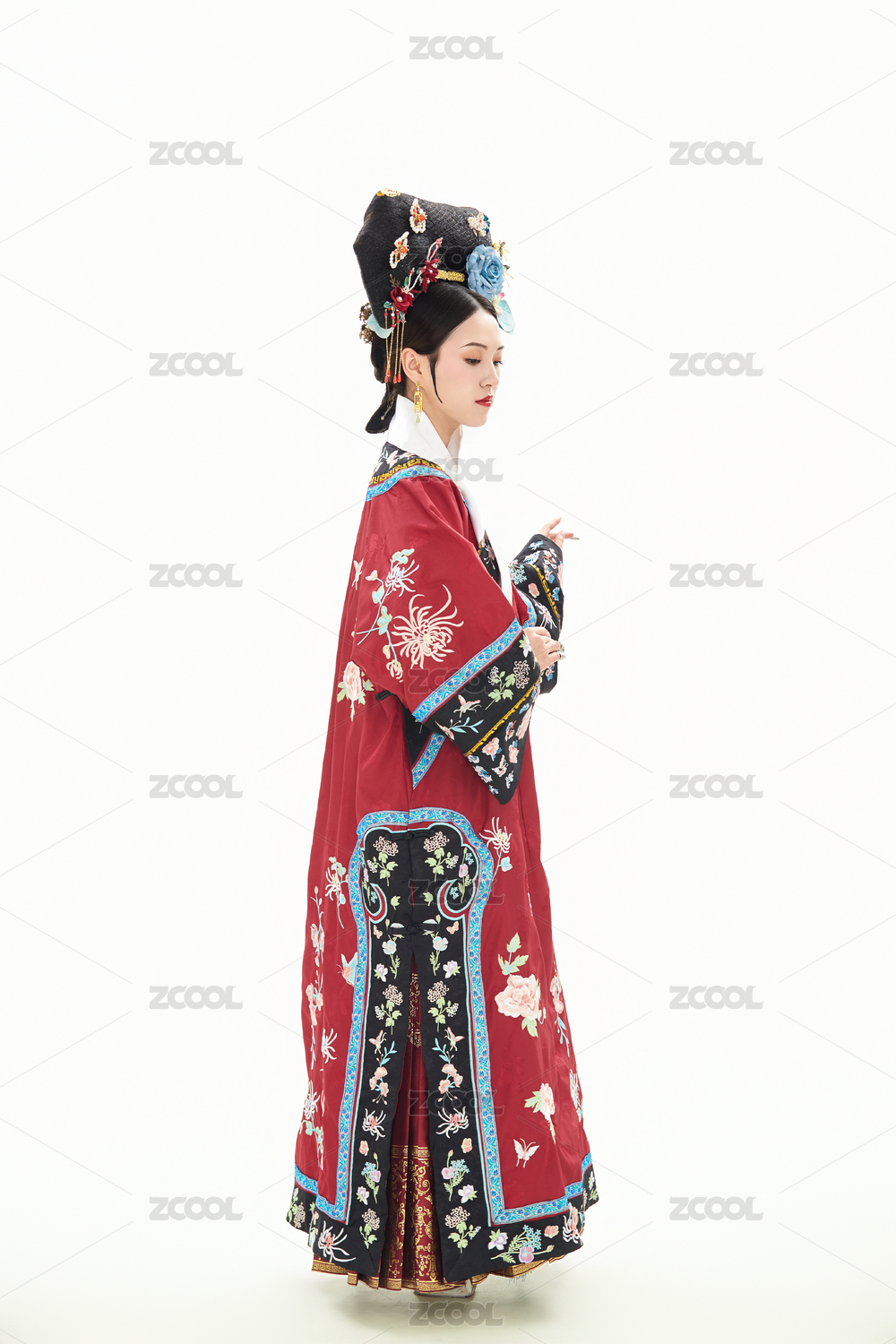 白色背景下穿着中国清朝宫廷服饰的女性