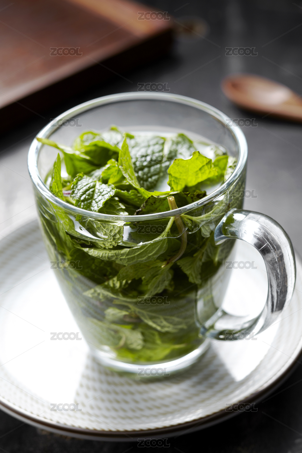 装满清水和薄荷叶的玻璃杯,在深色背景