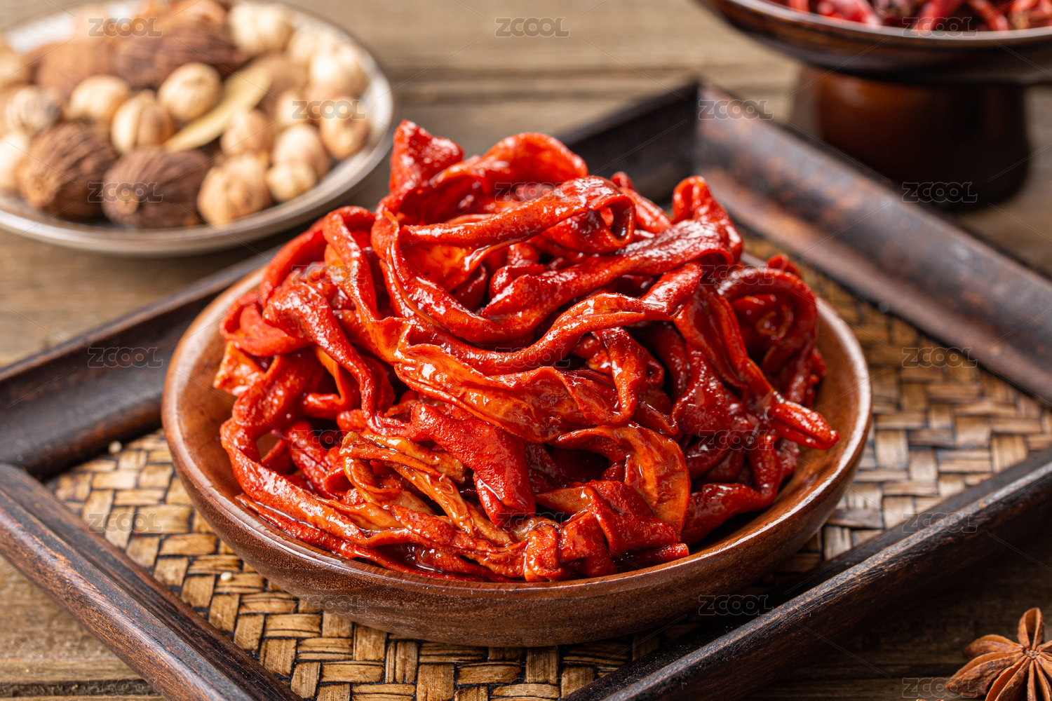 木纹背景上餐具中摆放的麻辣鸭肠