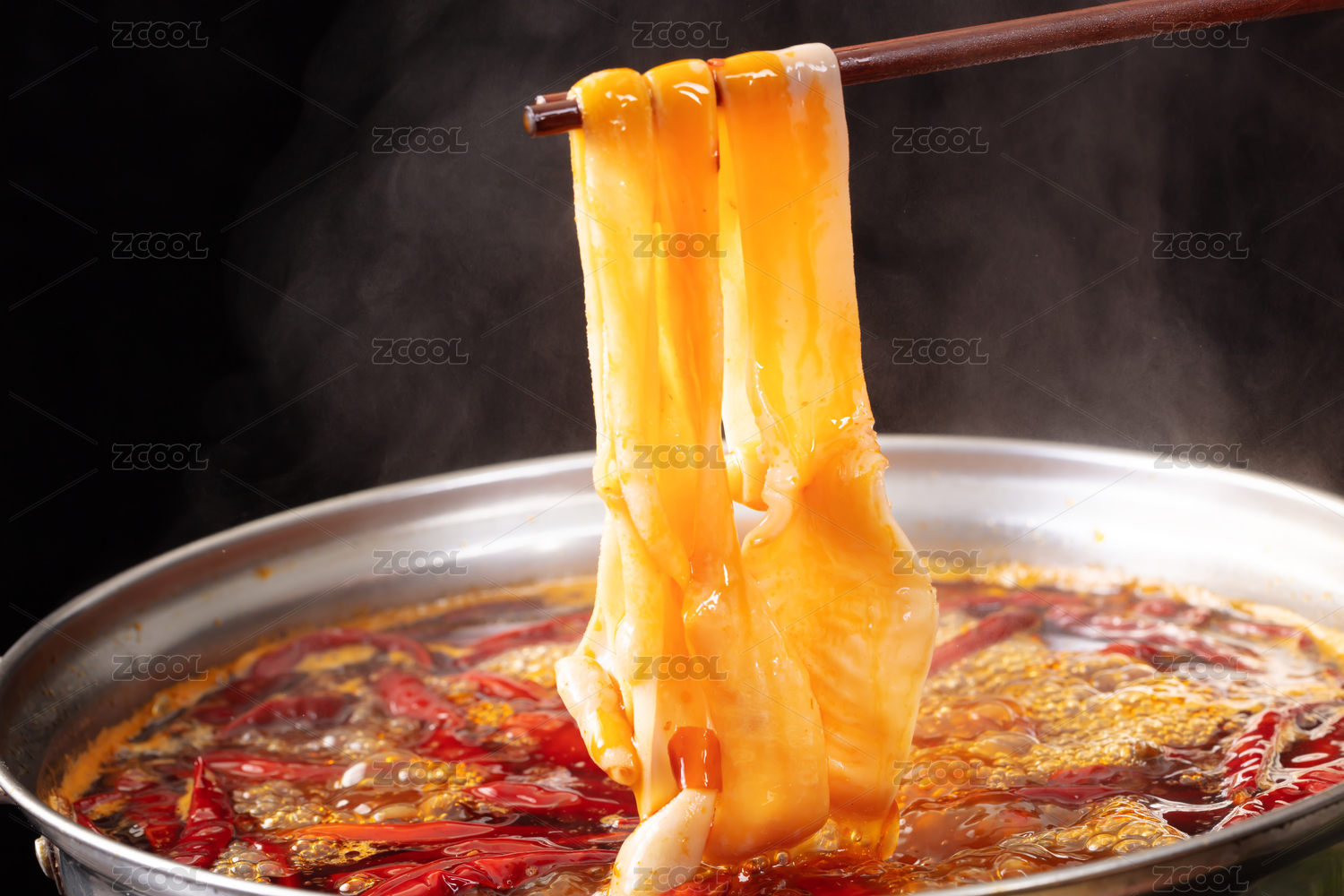 筷子夹着正在沸腾老火锅汤里烫鲜鸭肠鹅肠