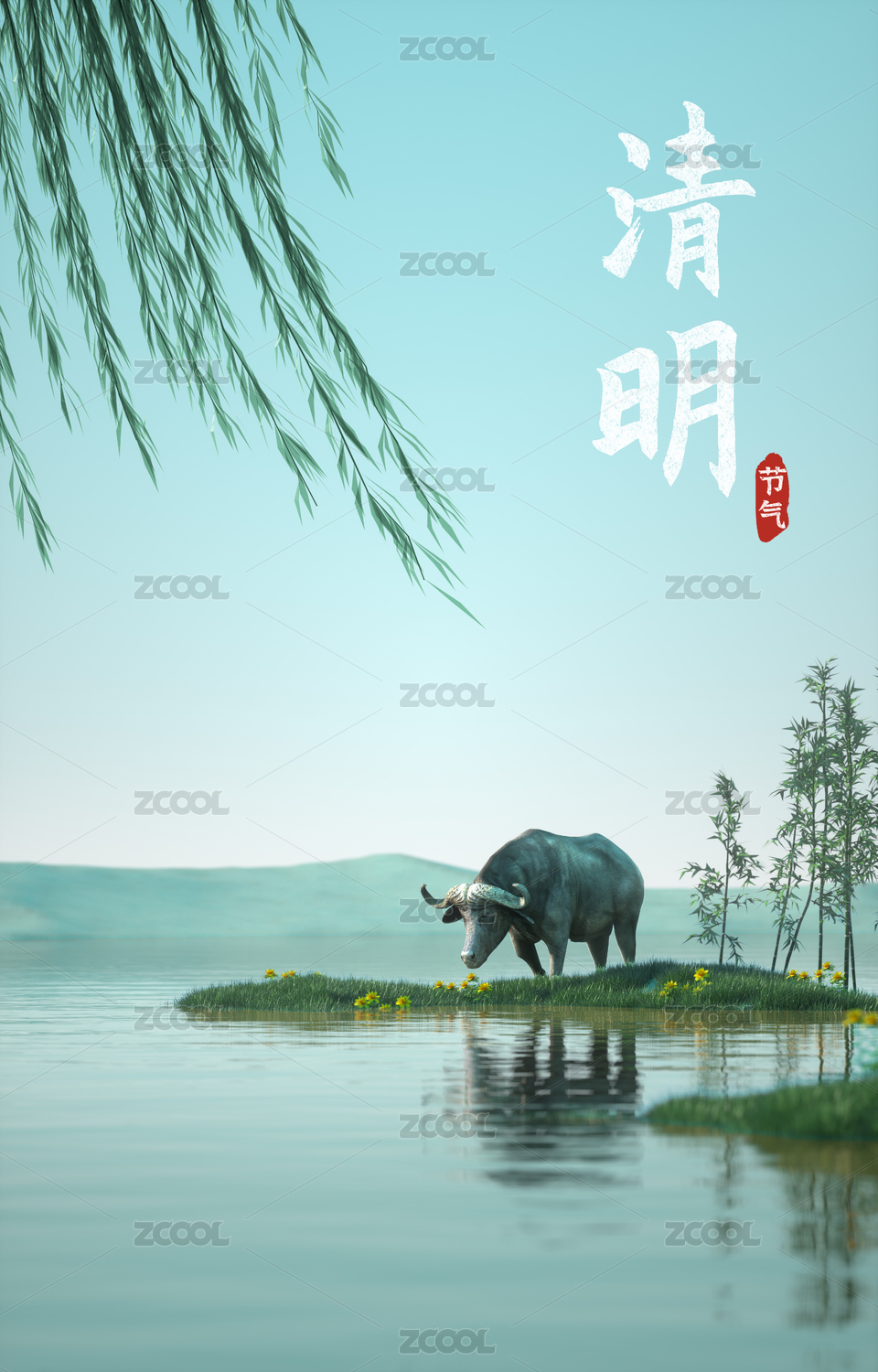 清明柳叶随风摆动水牛吃草节日3D宣传海报