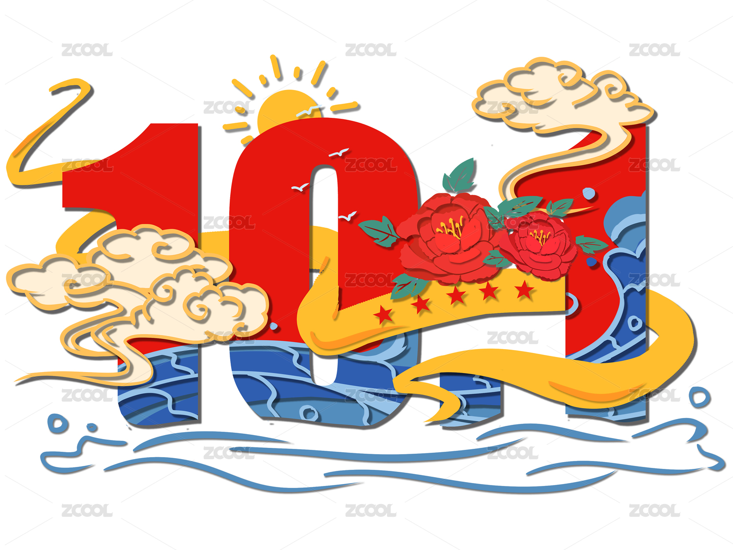 红蓝色剪纸国庆十一喜庆牡丹海浪祥云绸带