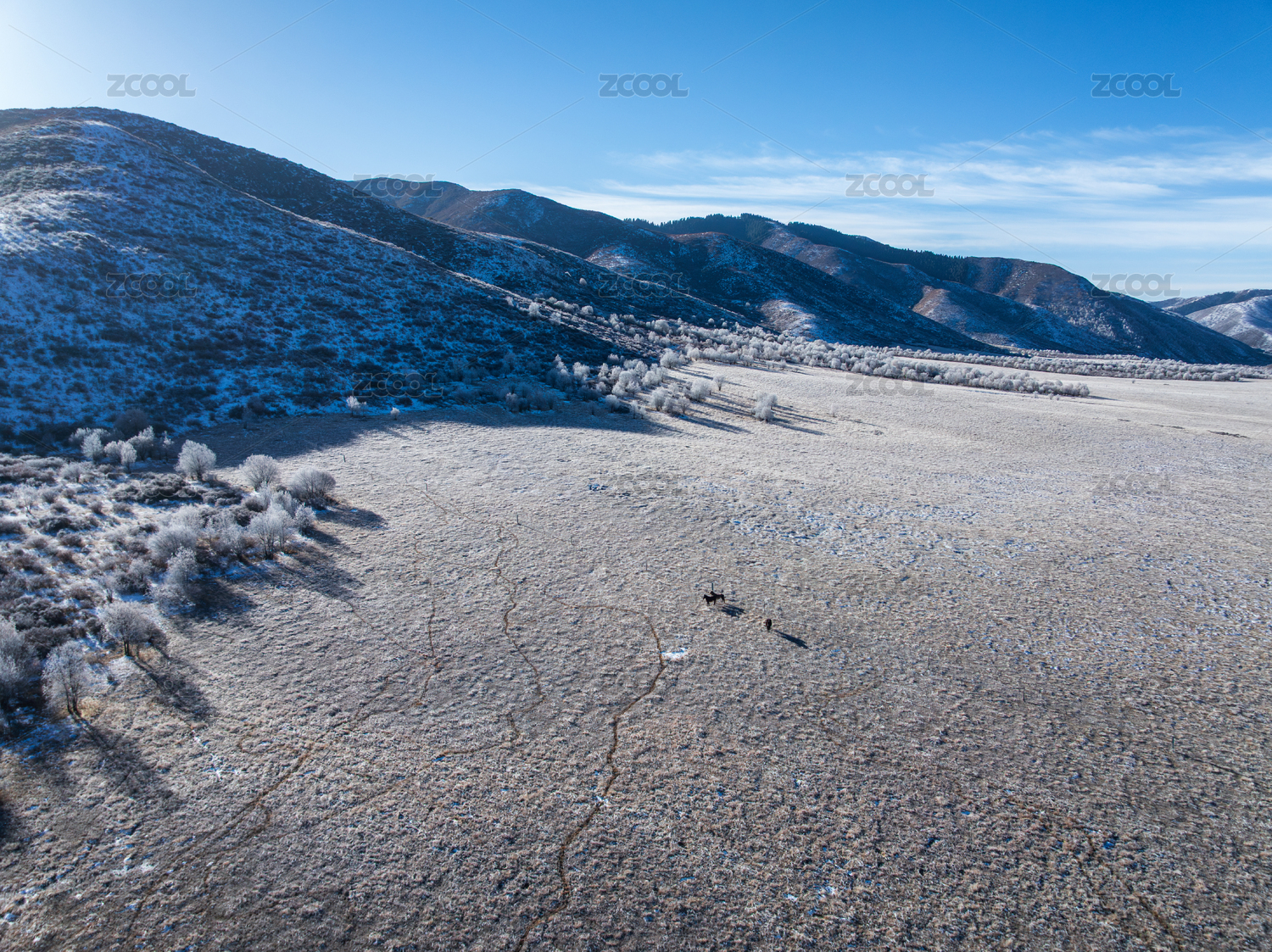 中国四川冬季雪后旷野中的马匹