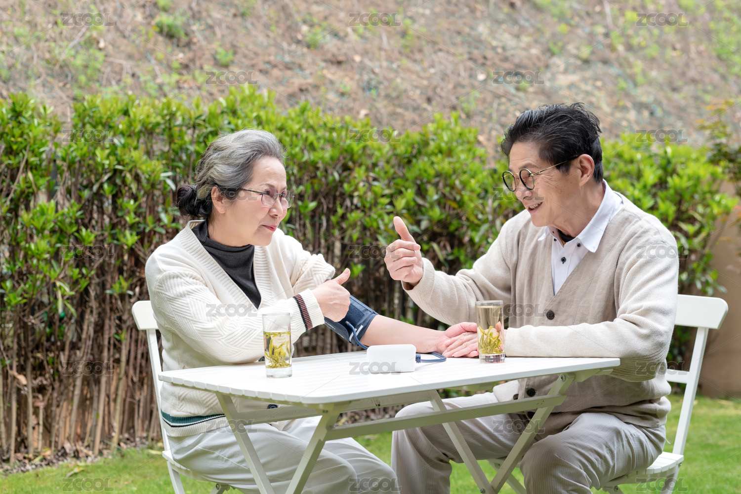 一对亚洲的老年夫妻在椅子上测量血压