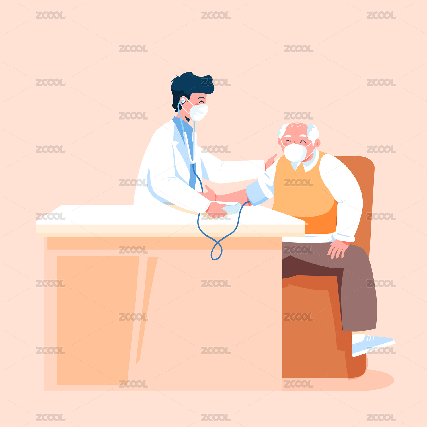 一个女医生正在给一个老爷爷测量血压插画