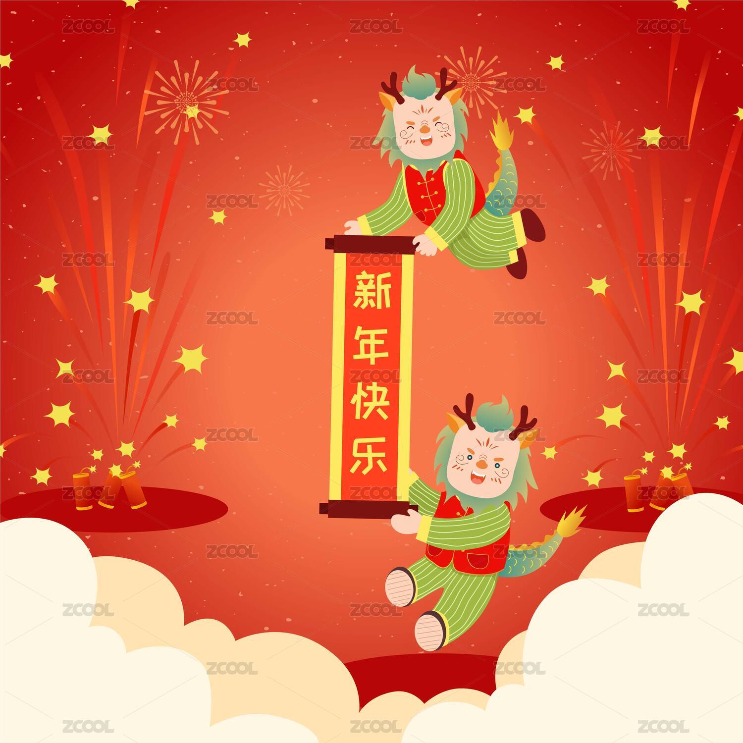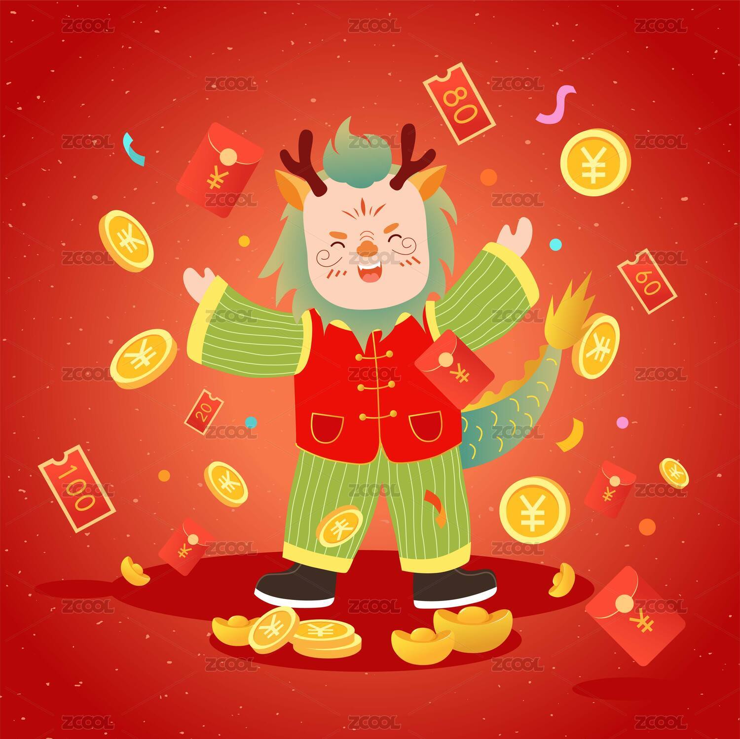 新年卡通龙跨年拜年福袋红包金币元宝金融理