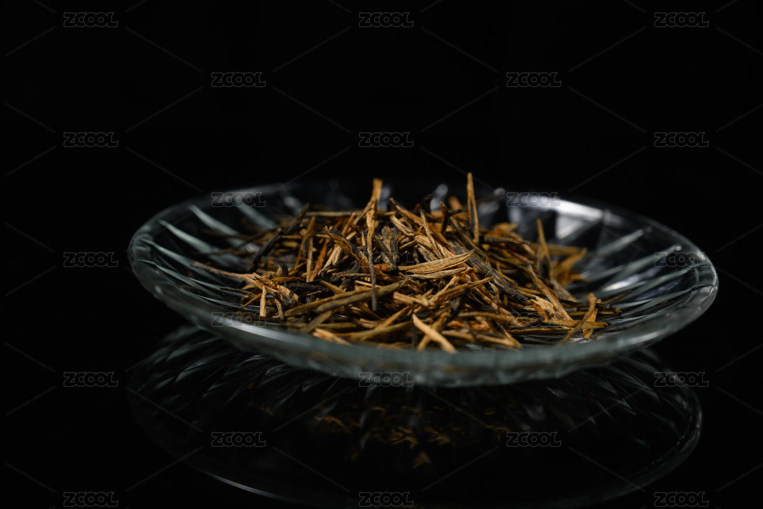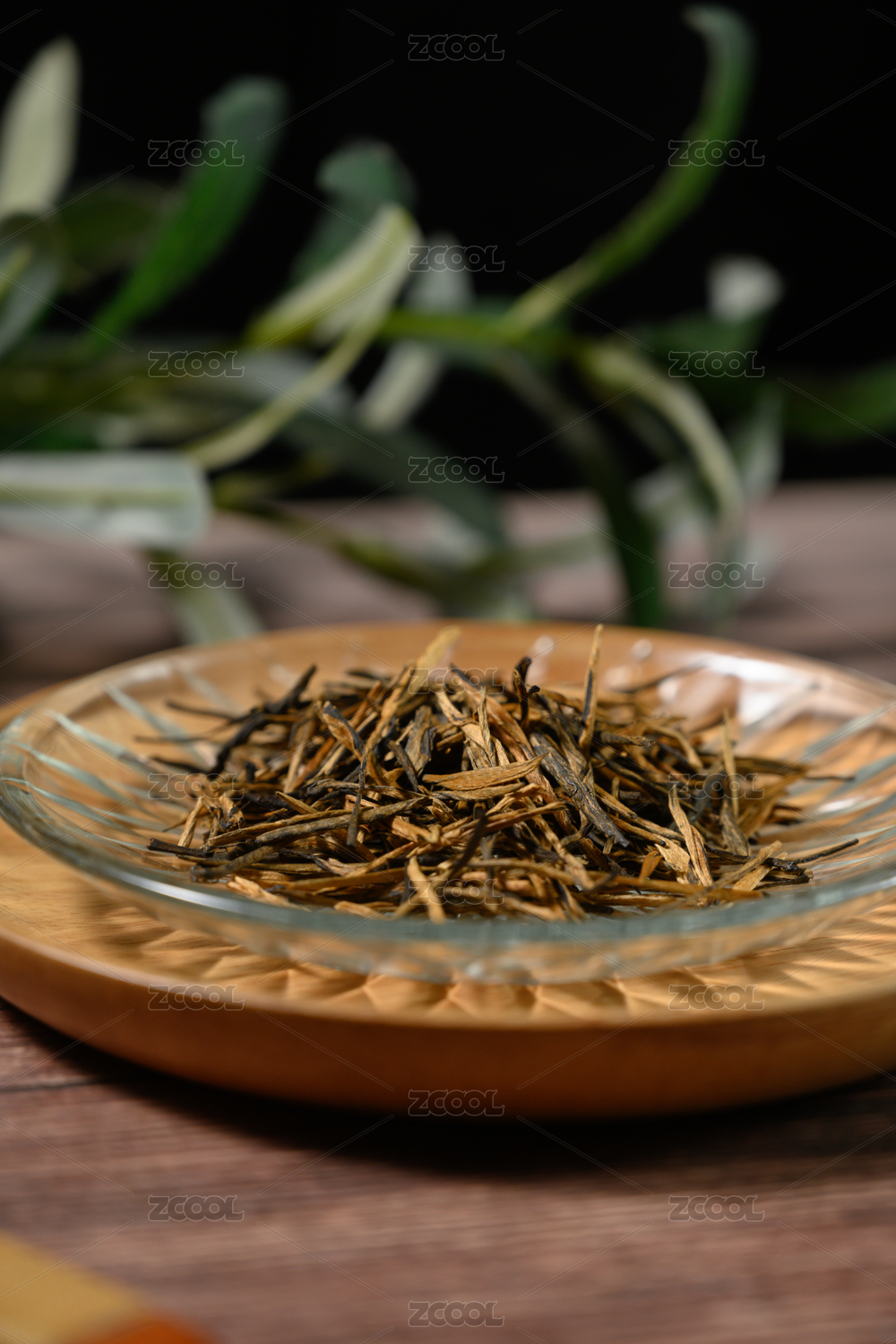 桌面上的盘子里的干爽切香气四溢的滇红金针