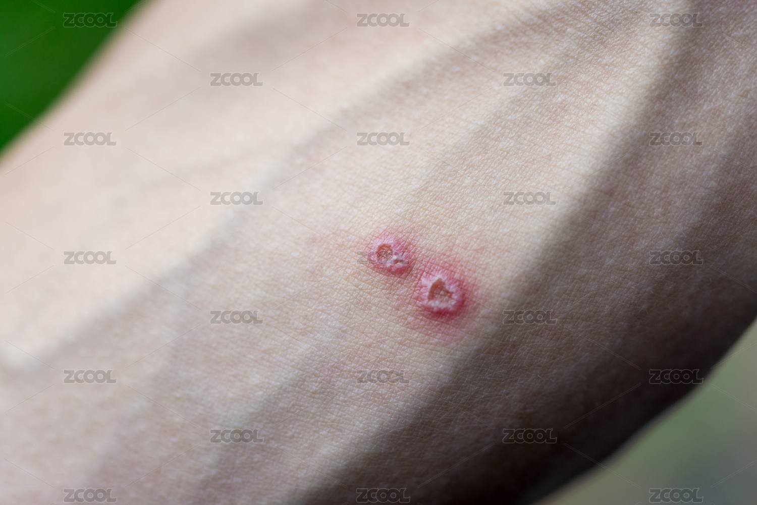 手臂上两个边缘突起中间凹陷的红色病斑