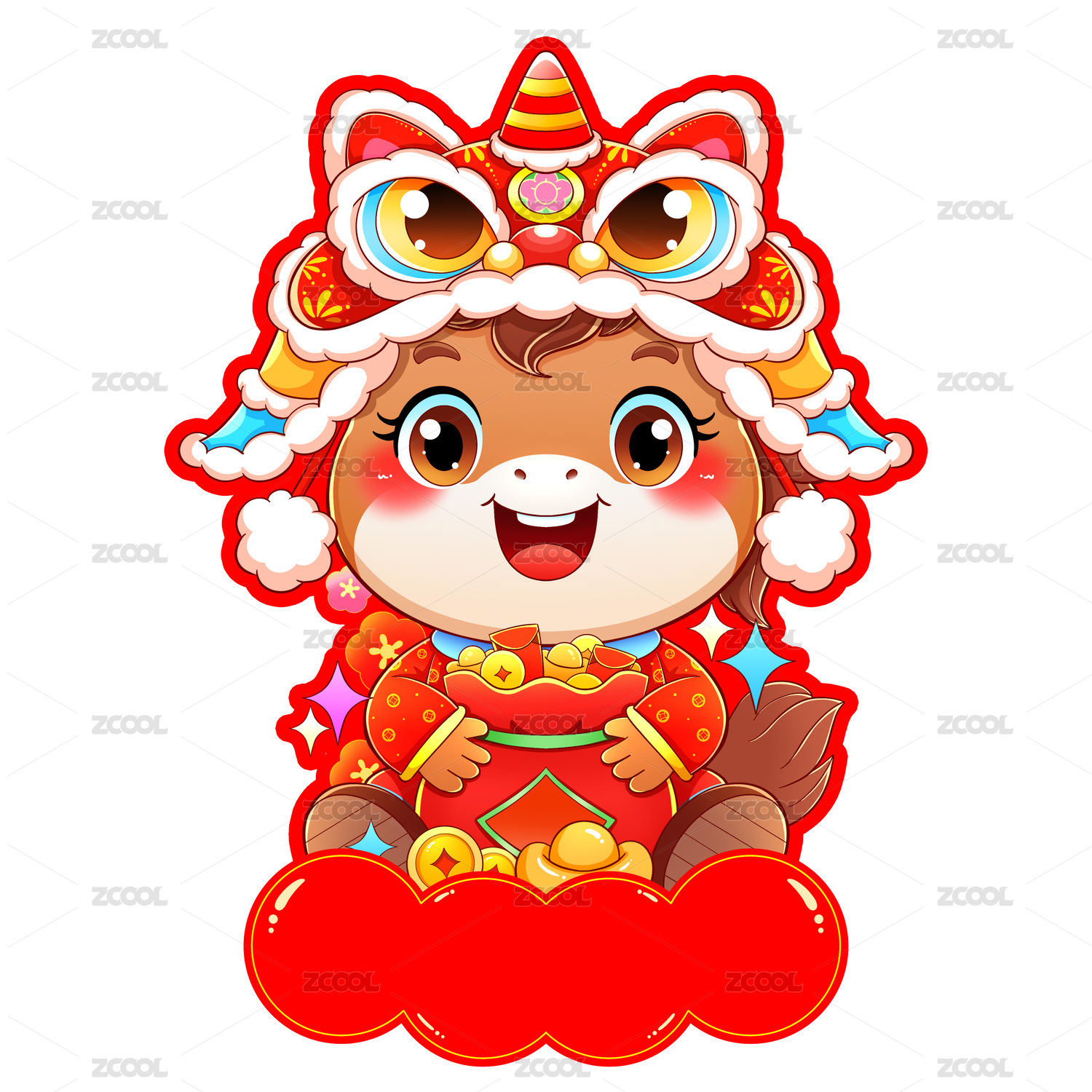 春节过年小马驹带铃铛福袋福气满满节日插画