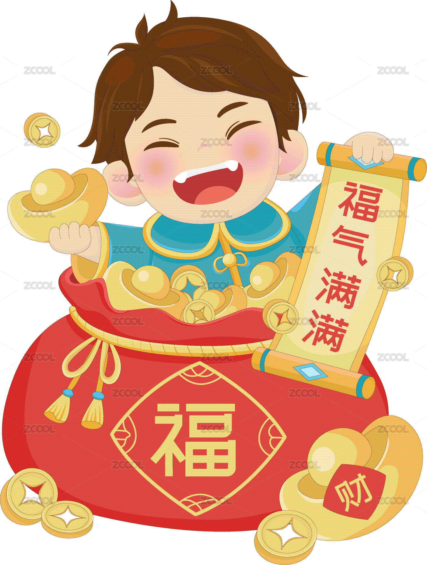 春节过年福袋金元宝福气满满快乐小男孩插画