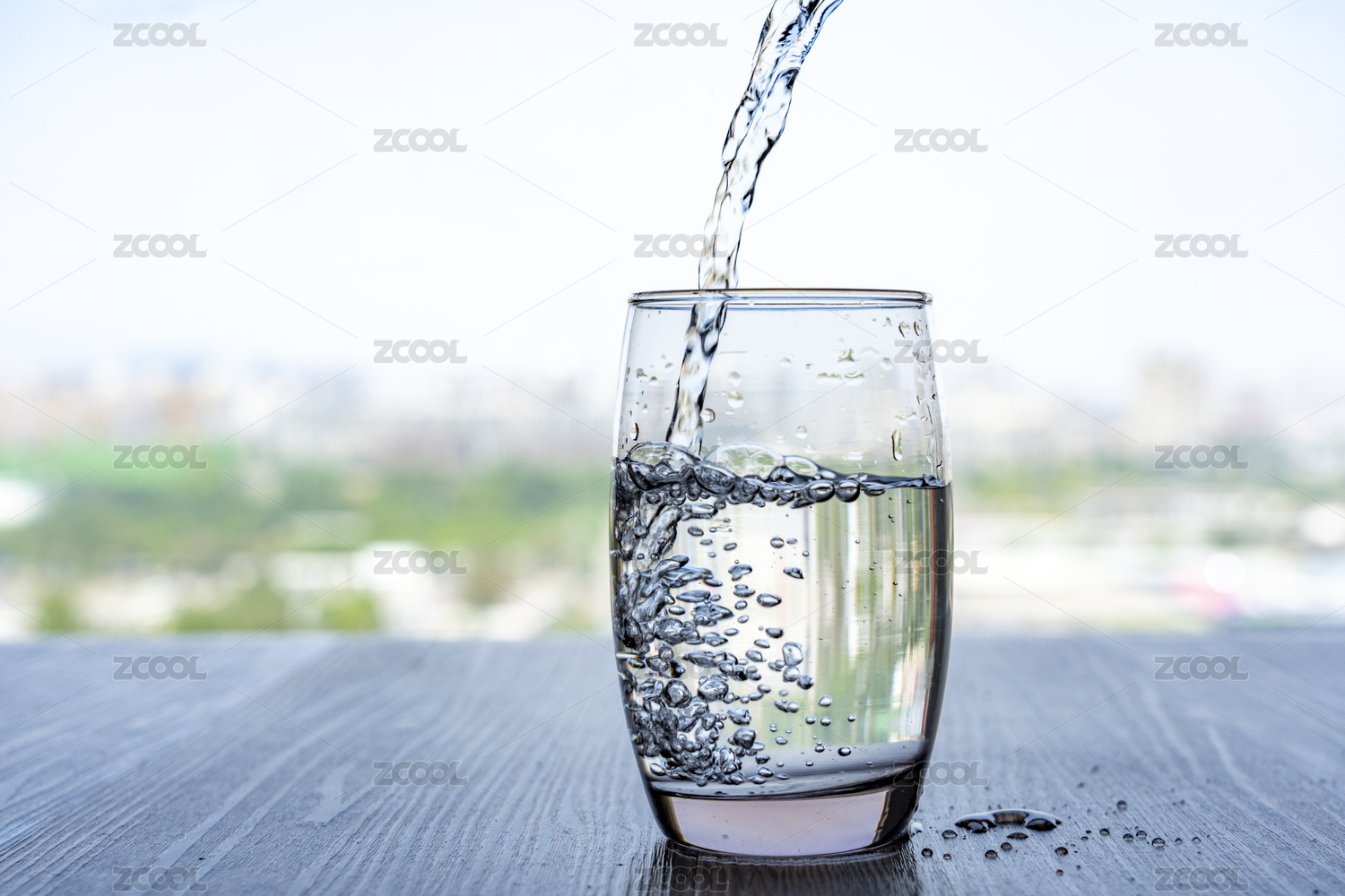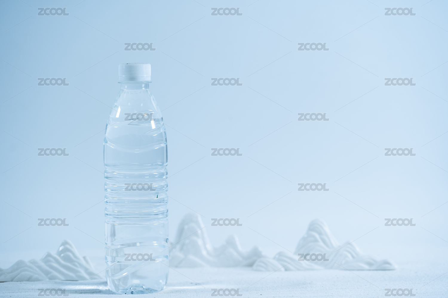 夏日阳光下放在绿色背景前的一瓶纯净水