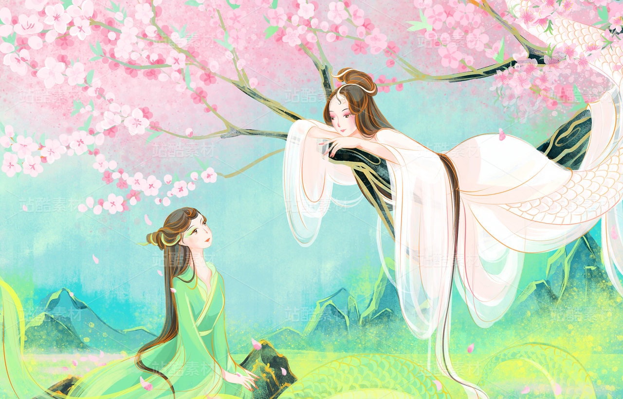中国神话传说青蛇白蛇桃花山水国潮插画