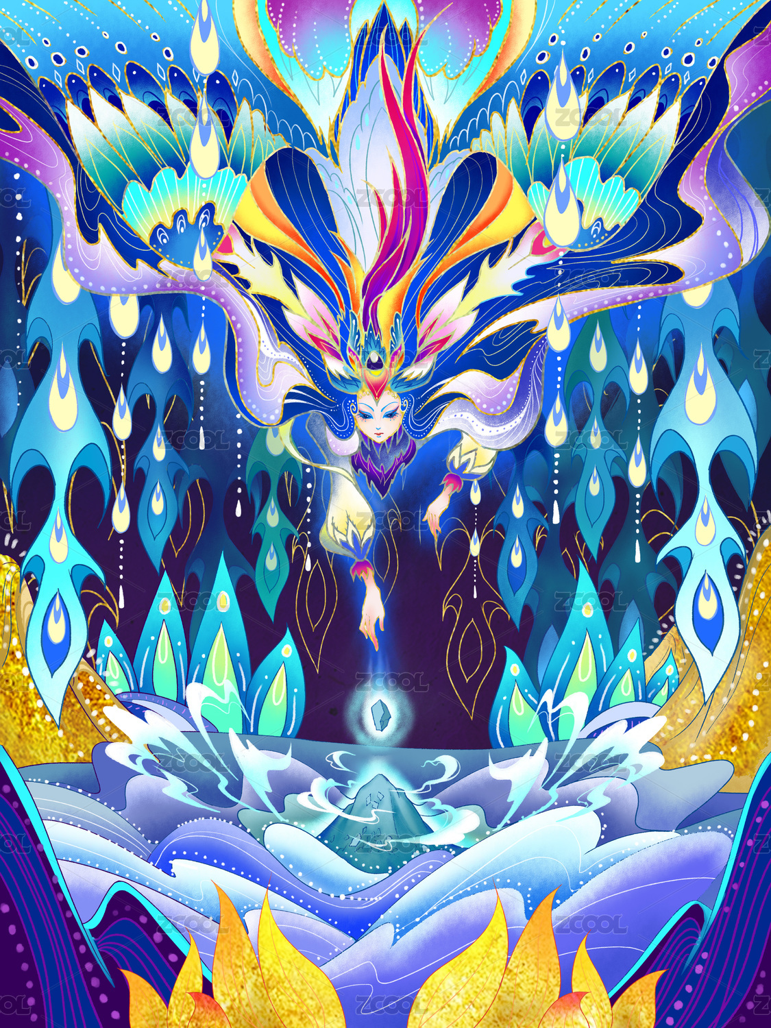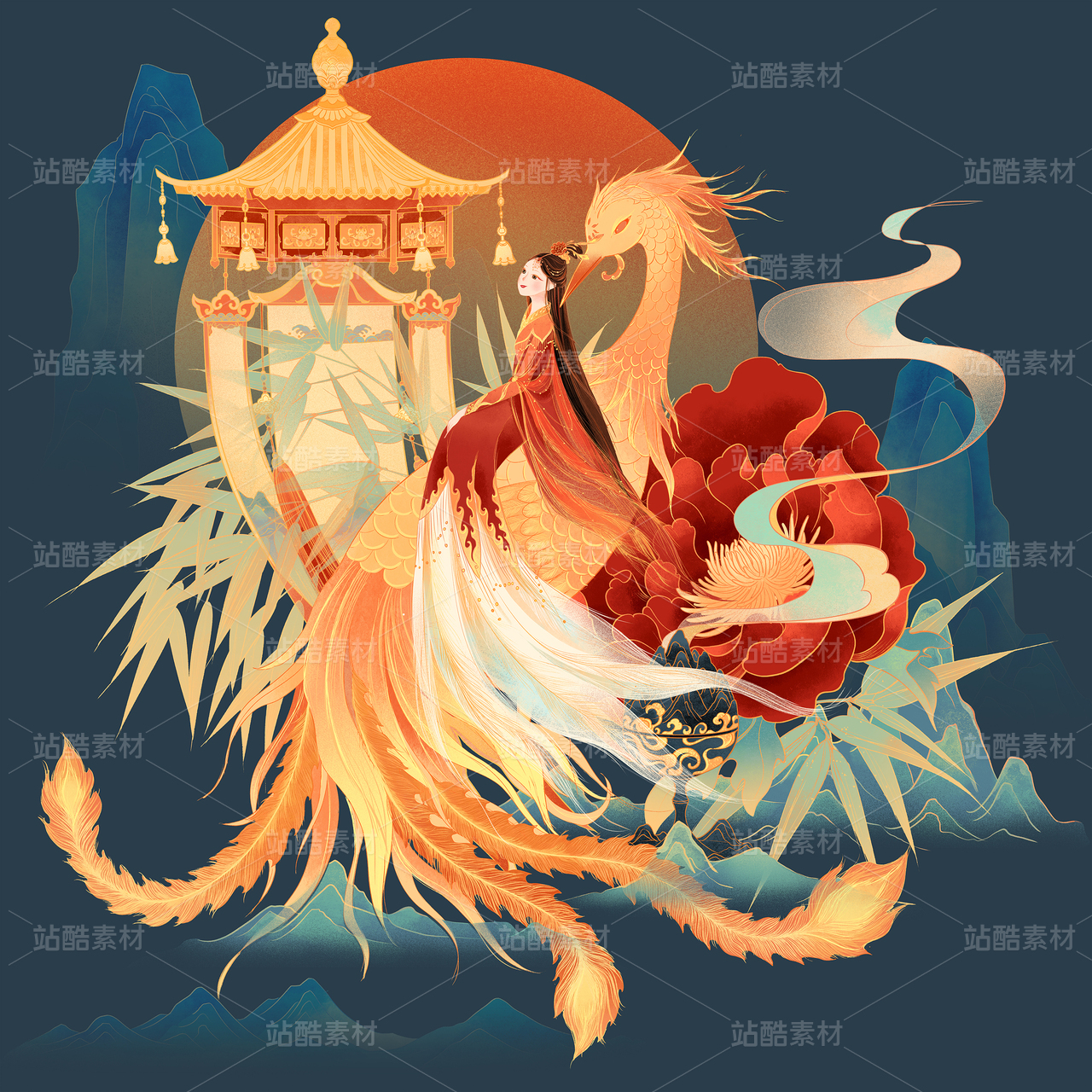 中国神话传说凤凰九天玄女牡丹国潮插画