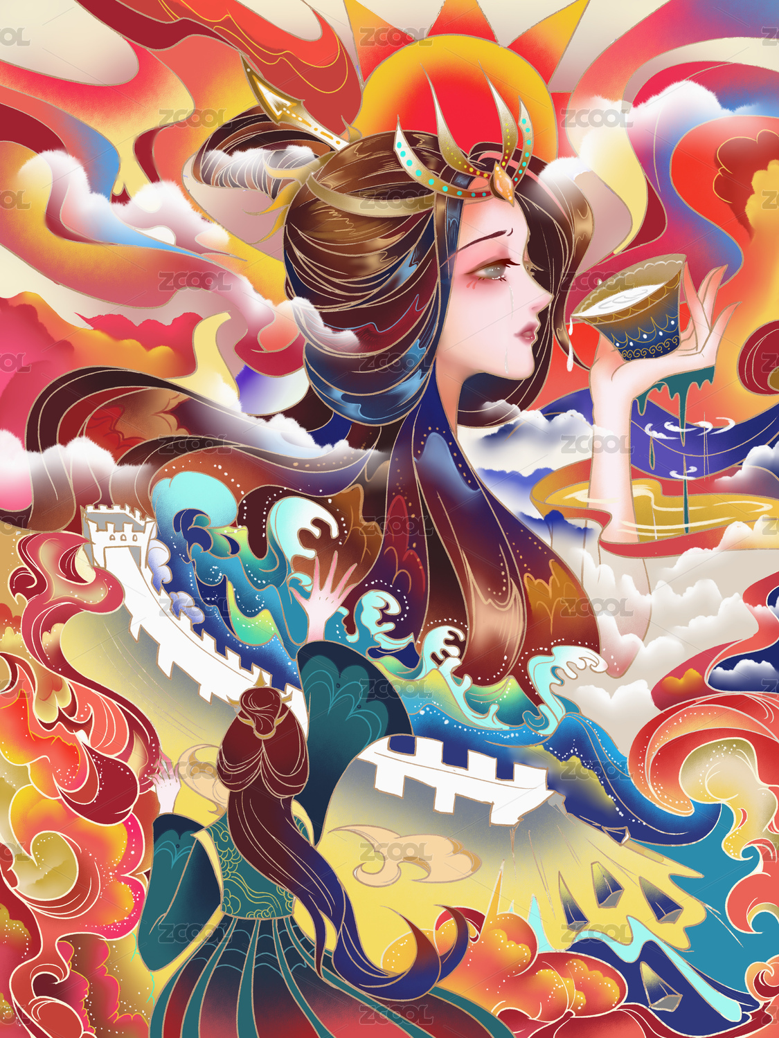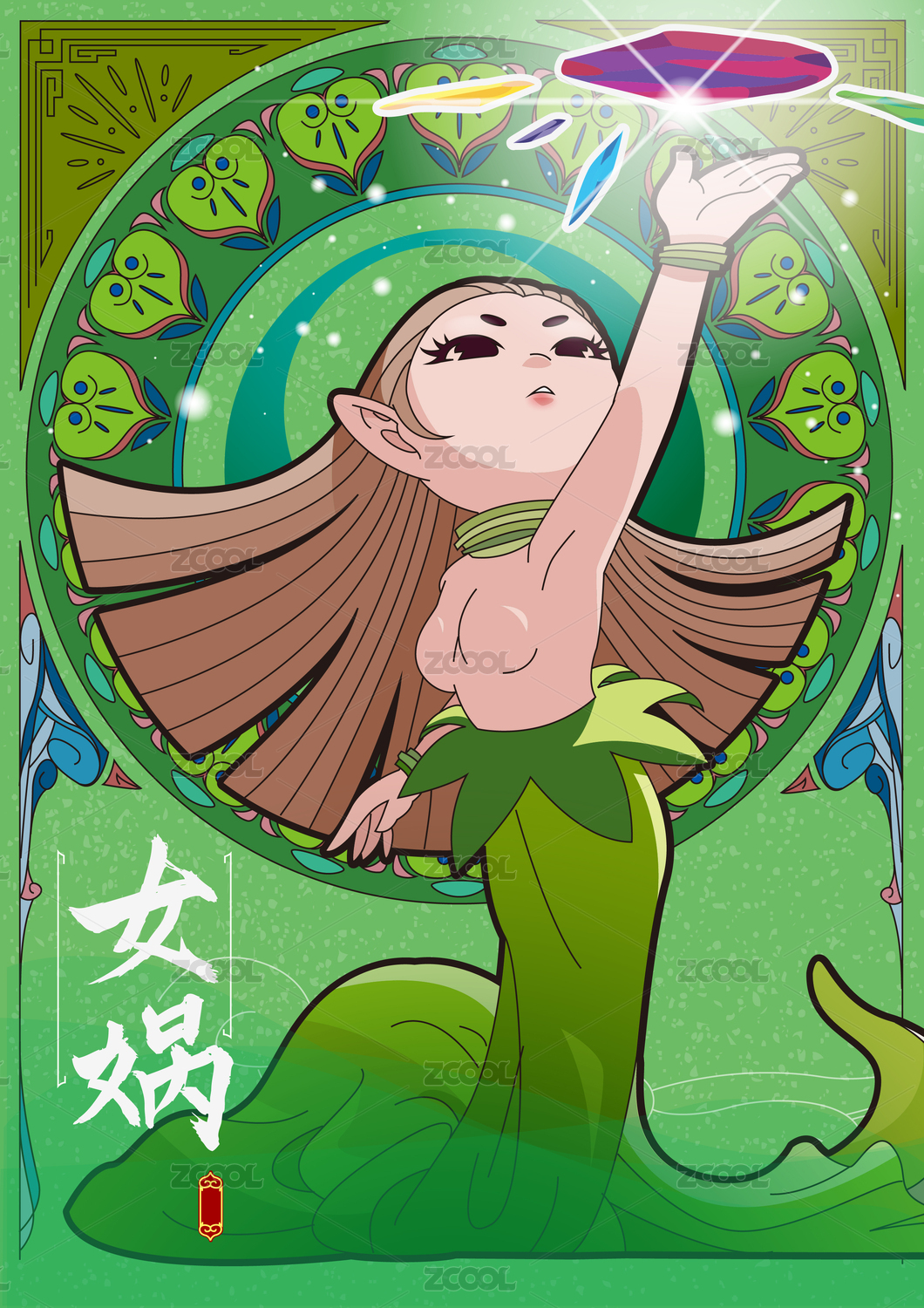 矢量中国神话故事山海经可爱国潮女娲补天