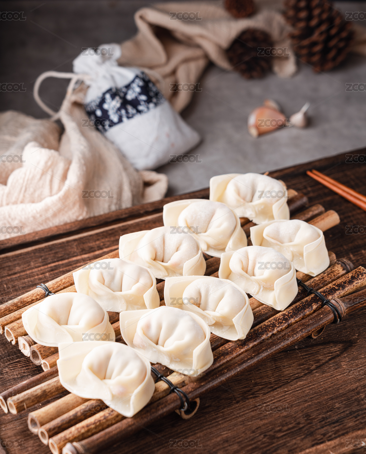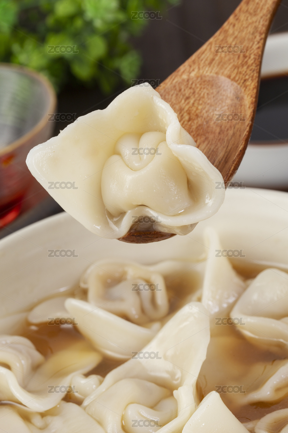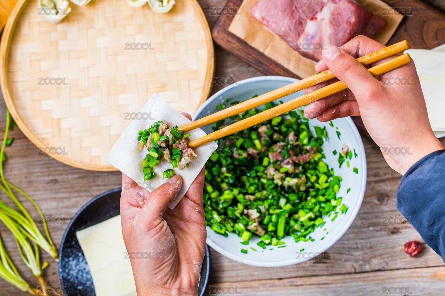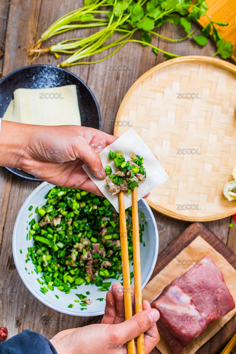 手拿筷子夹韭菜猪肉馅准备放在馄炖皮上包馄炖