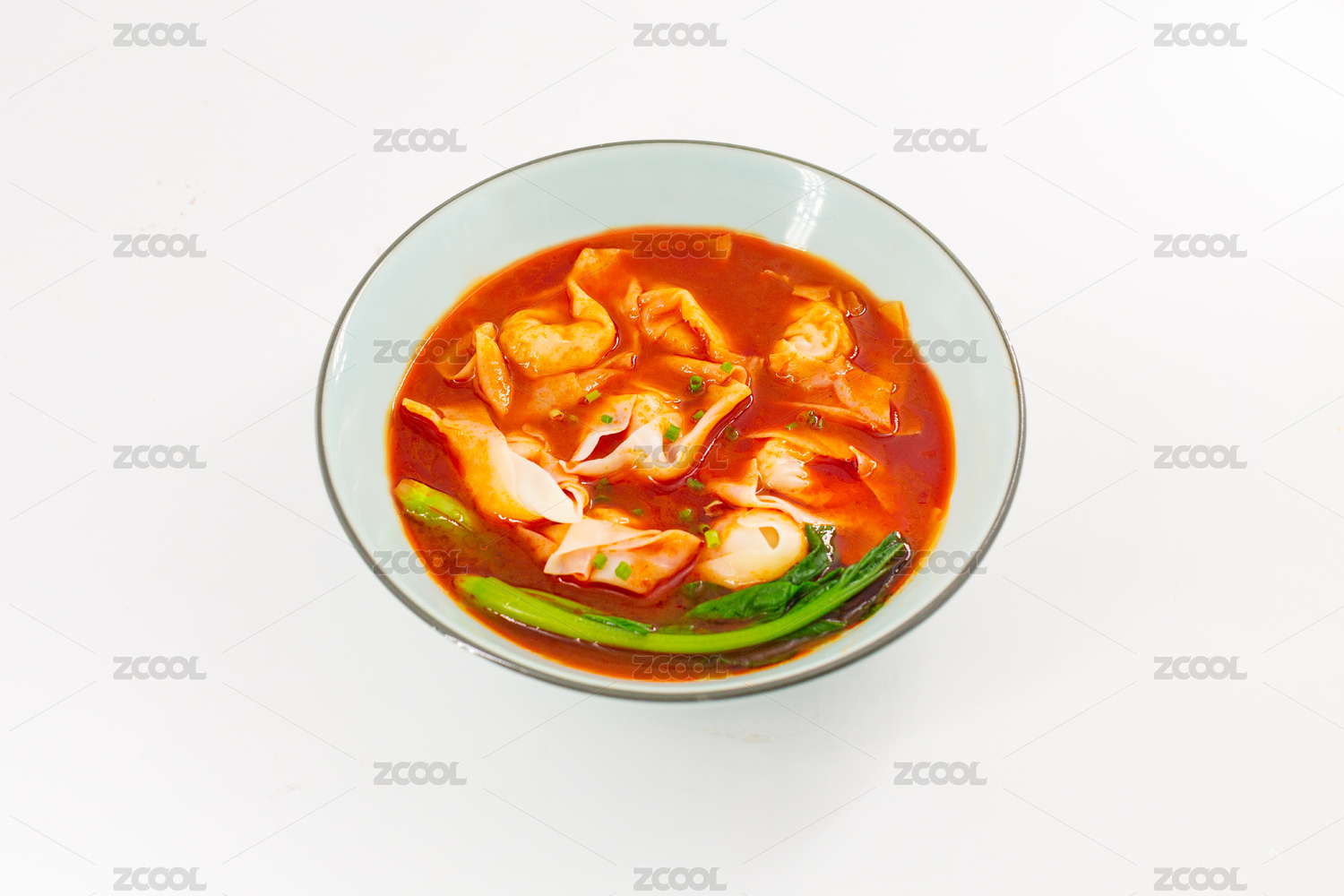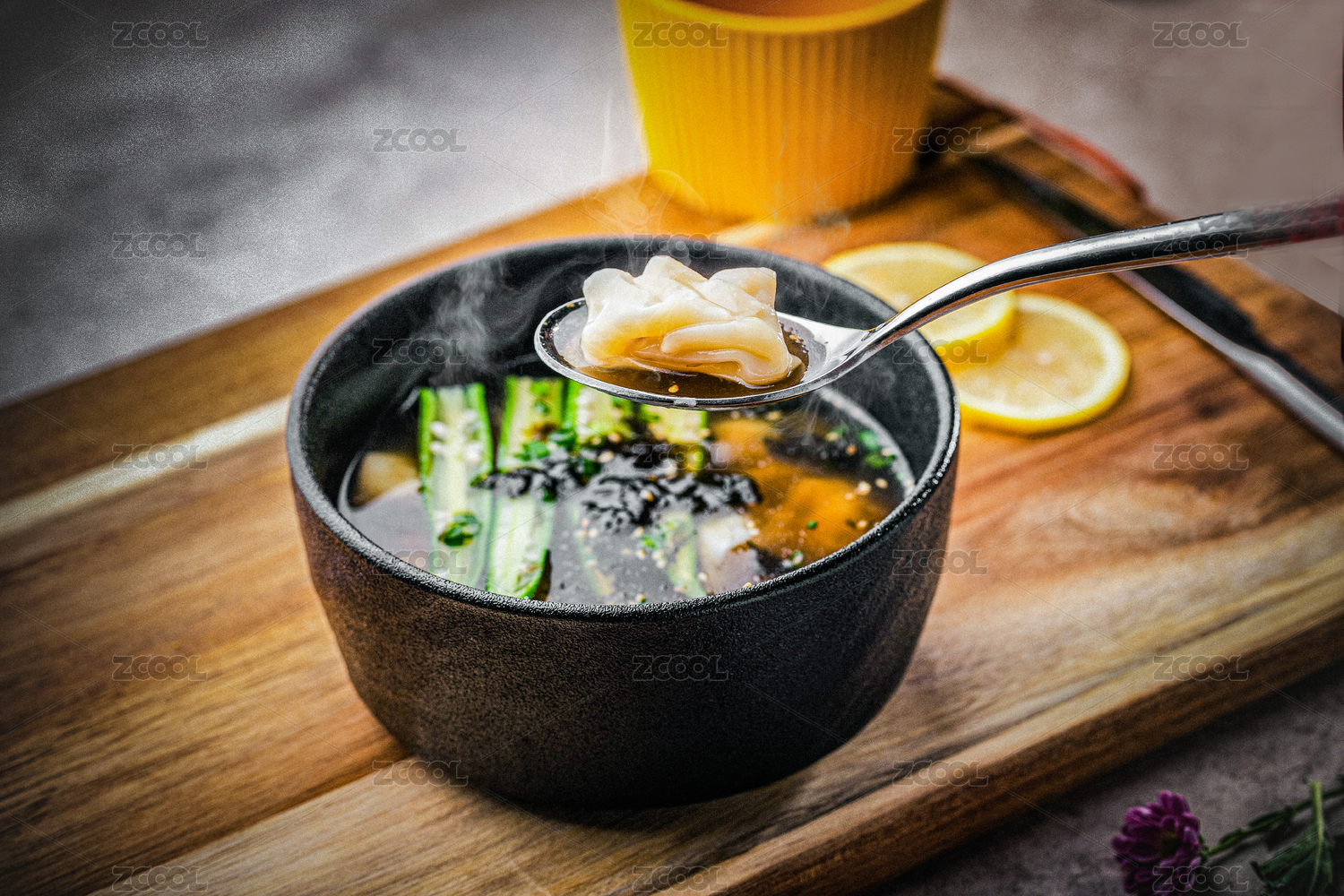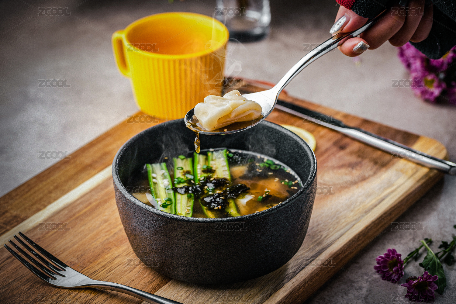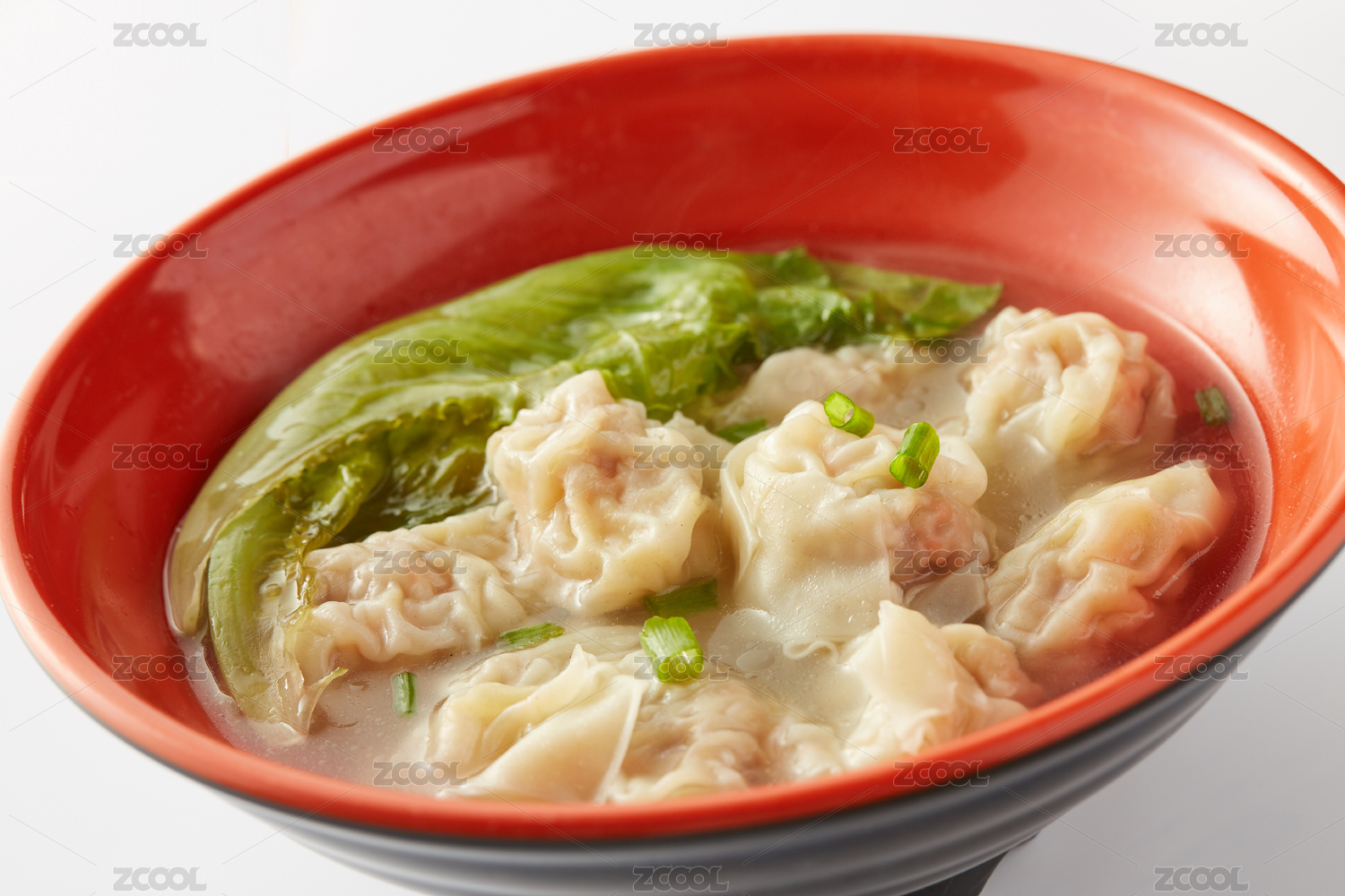 手拿筷子夹韭菜猪肉馅准备放在馄炖皮上包馄炖