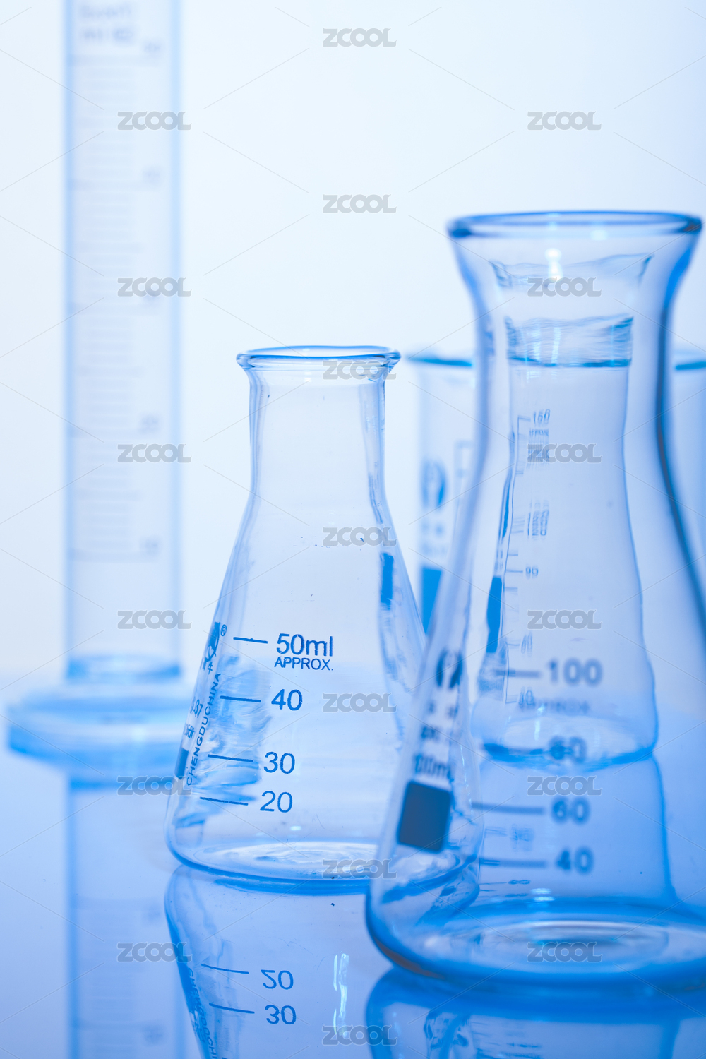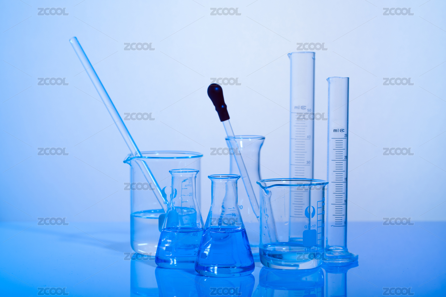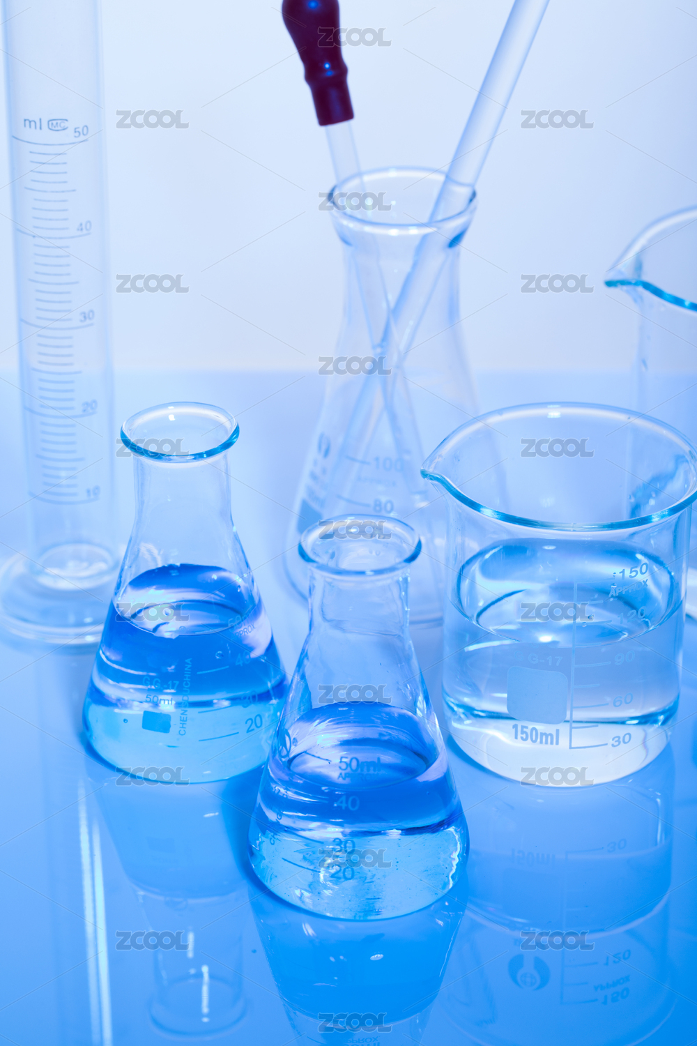 浅蓝色背景前摆放医疗化学实验玻璃仪器