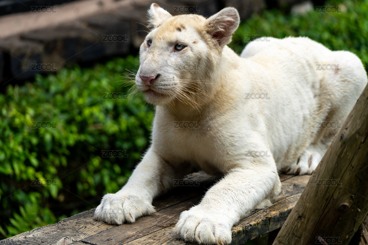 动物园卧在木板上的白虎幼虎