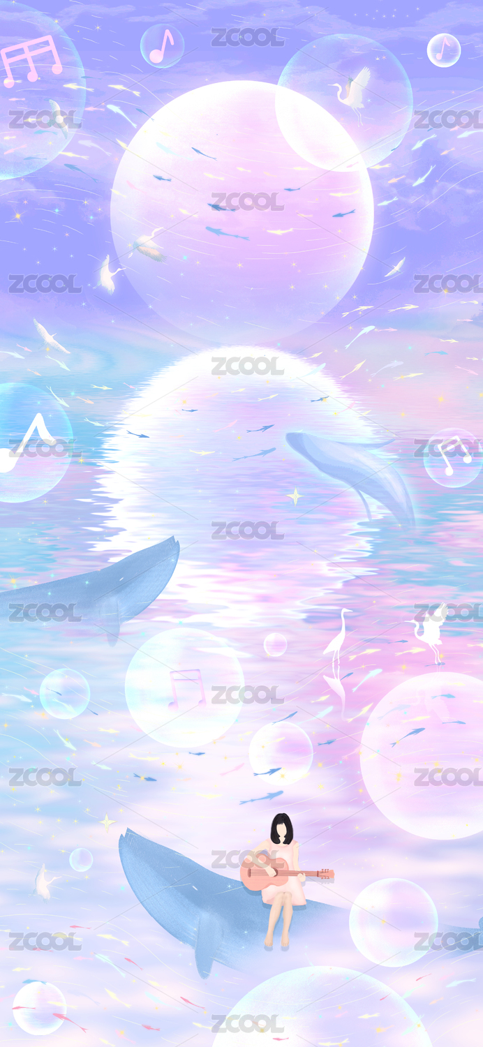 夏天月亮悬浮在夜空中,少女坐在大海中的蓝鲸背上弹吉他,鱼群伴随着音乐歌声在身侧跳舞超现实插画背景海报
