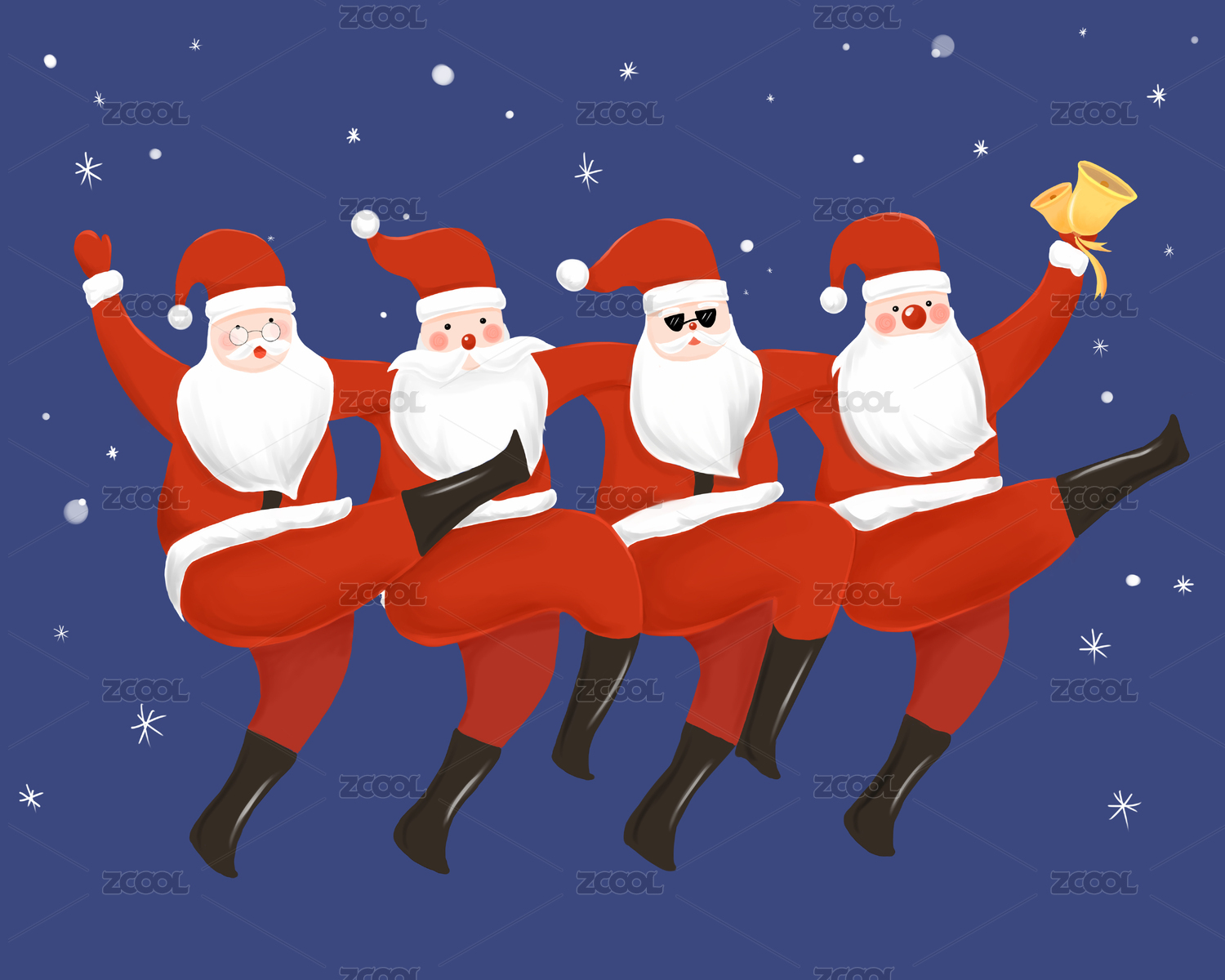 圣诞节四个一起跳舞的圣诞老人庆祝 手绘卡通插画