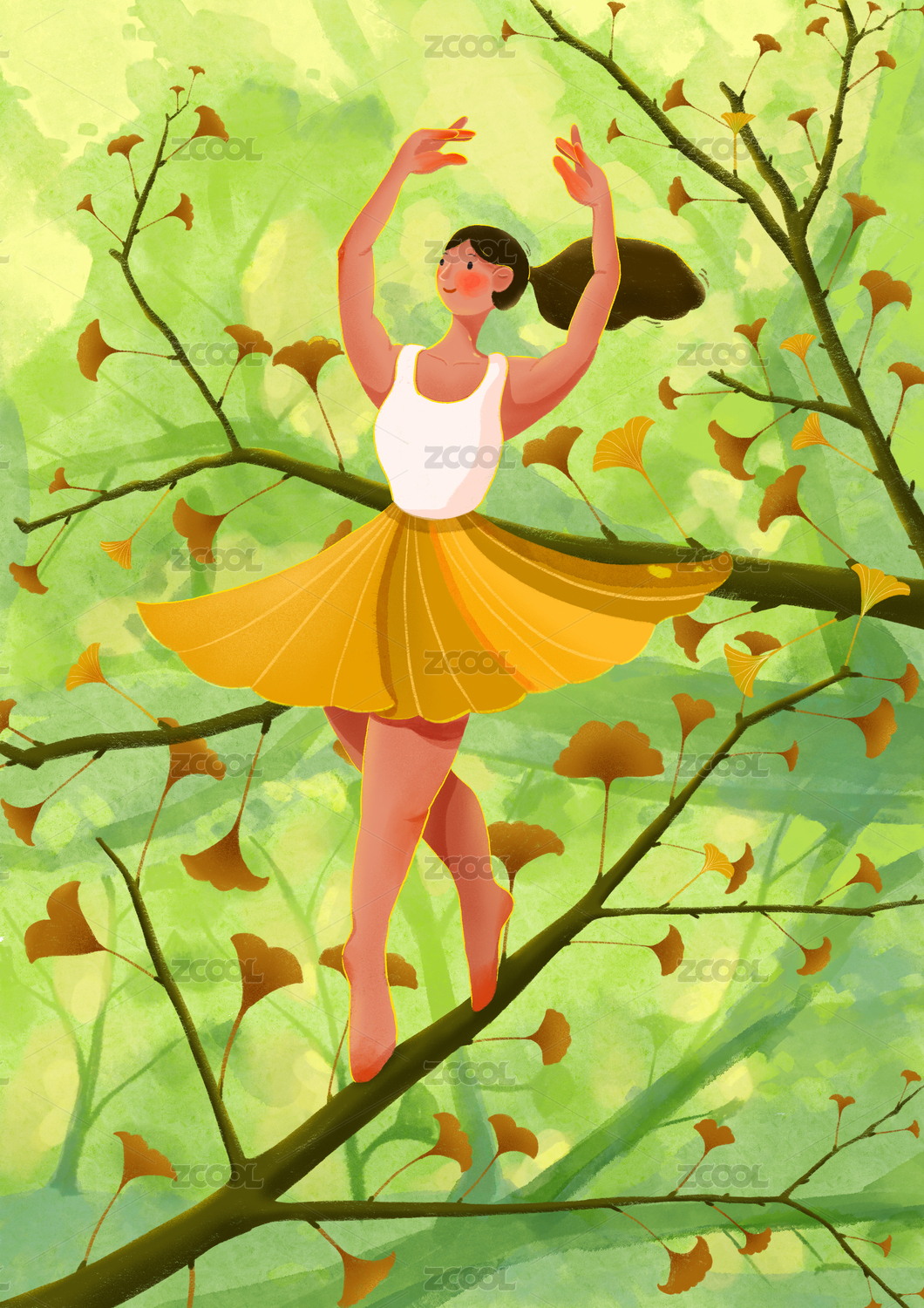 在银杏树上跳舞的女孩插画