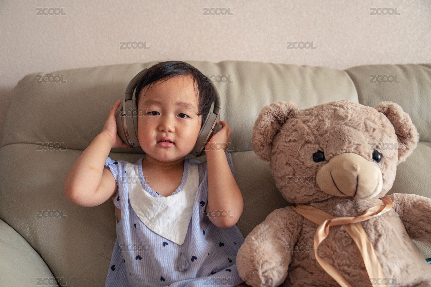 中国宝宝坐在沙发上,戴着耳机耳麦听音乐、旁边是她的玩具熊