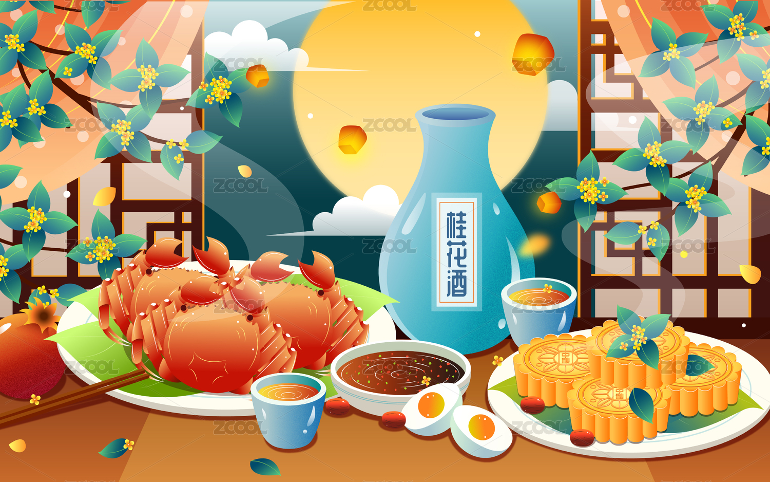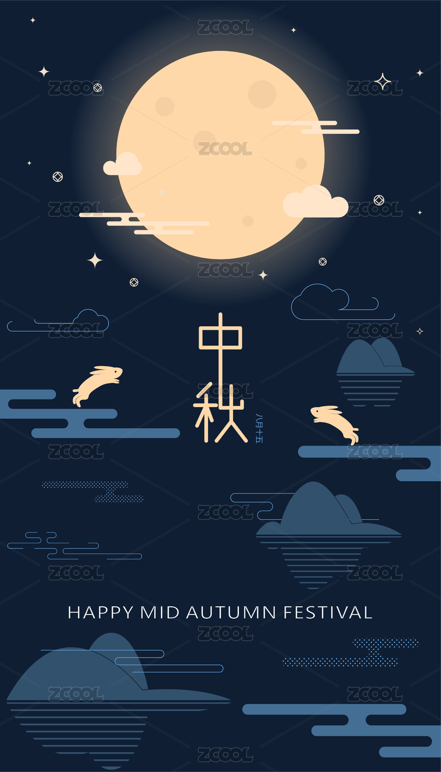 中秋佳节 八月十五明月玉兔山川河流星空 矢量 插画