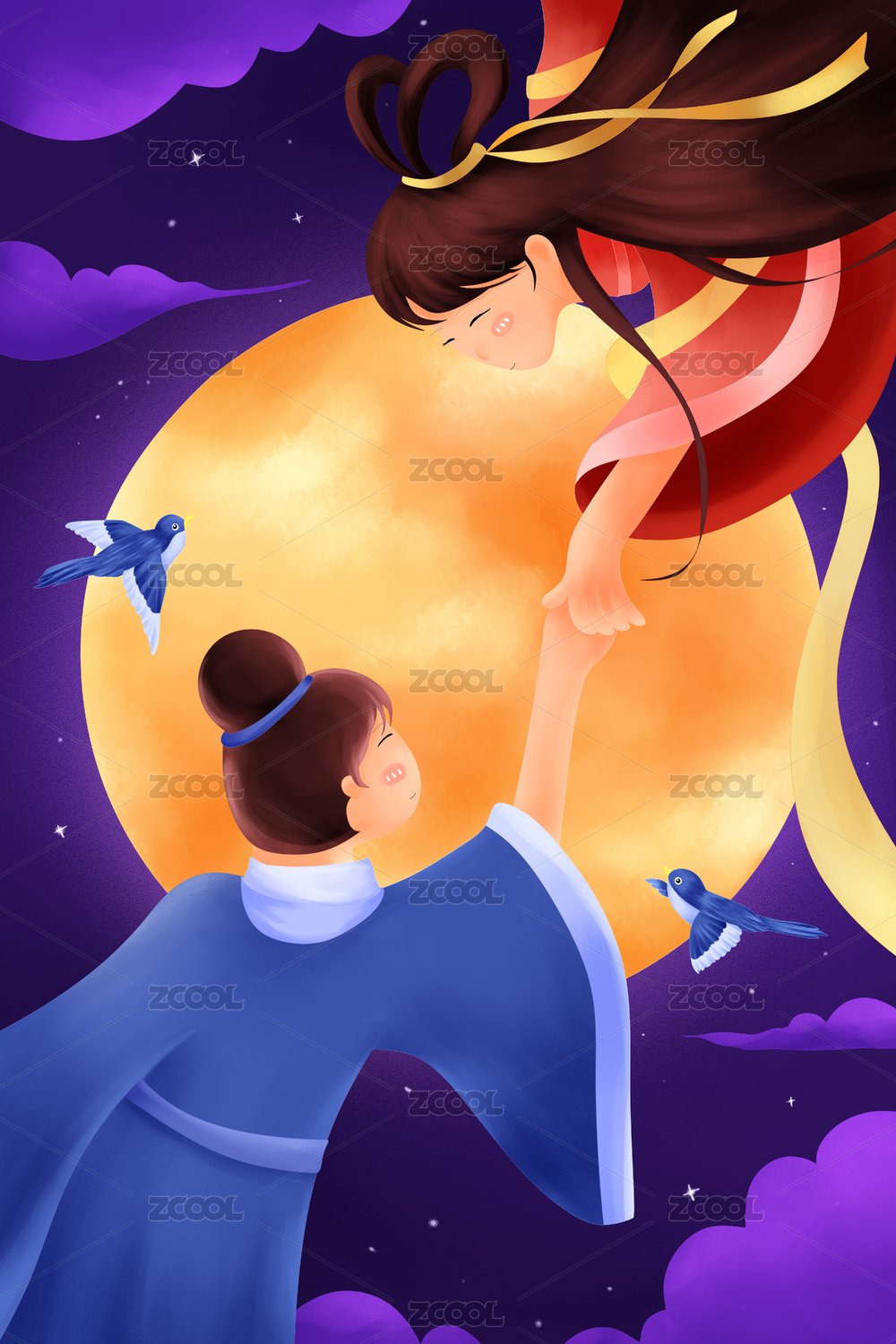 七夕牛郎织女在月亮下牵手插画