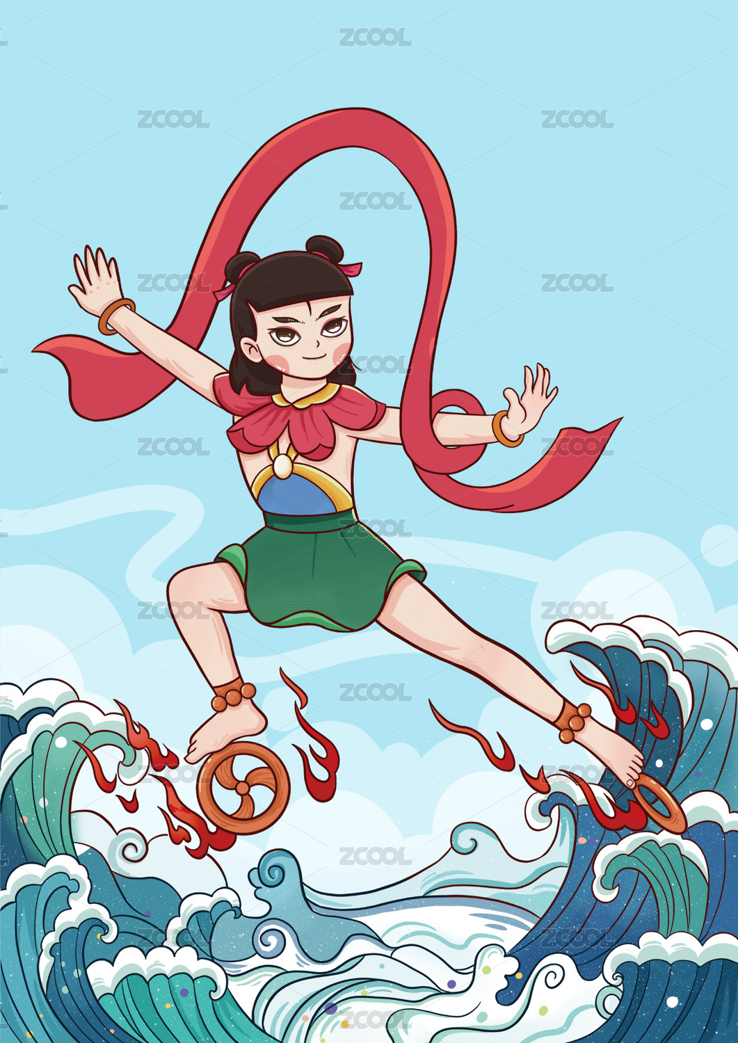 哪吒闹海神话故事国潮插画