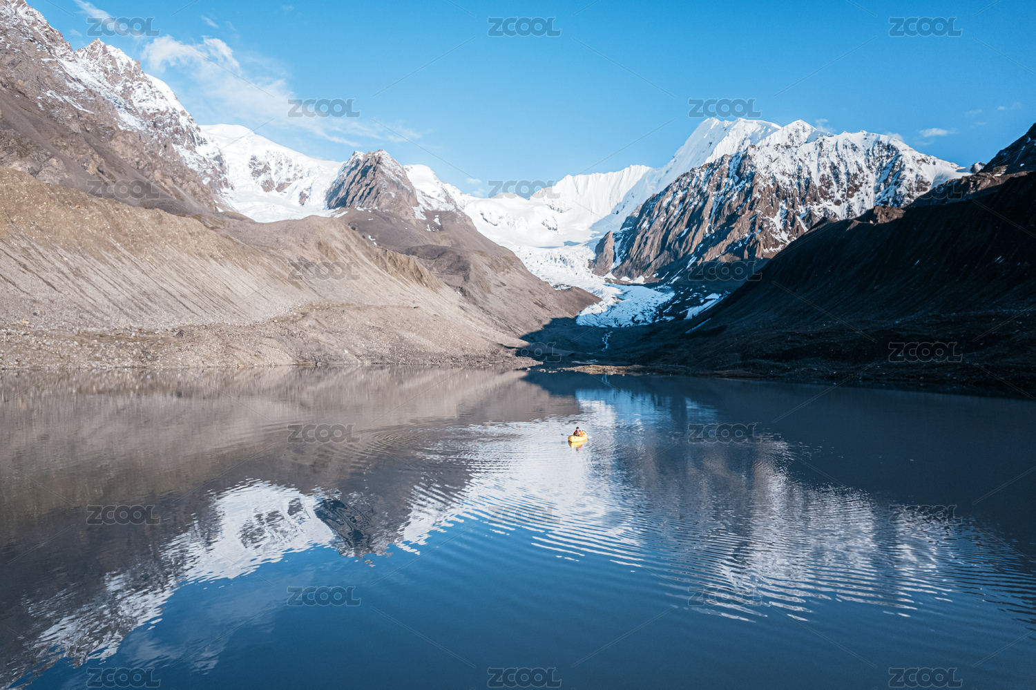 中国四川甘勒多曼因冰川与冰碛湖上的皮划艇