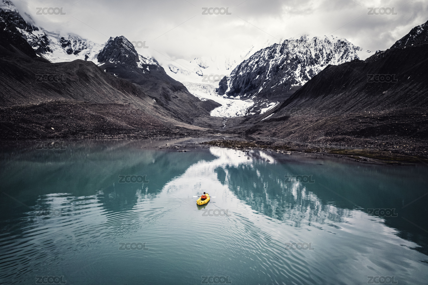 中国四川勒多曼因冰川与冰碛湖上的皮划艇