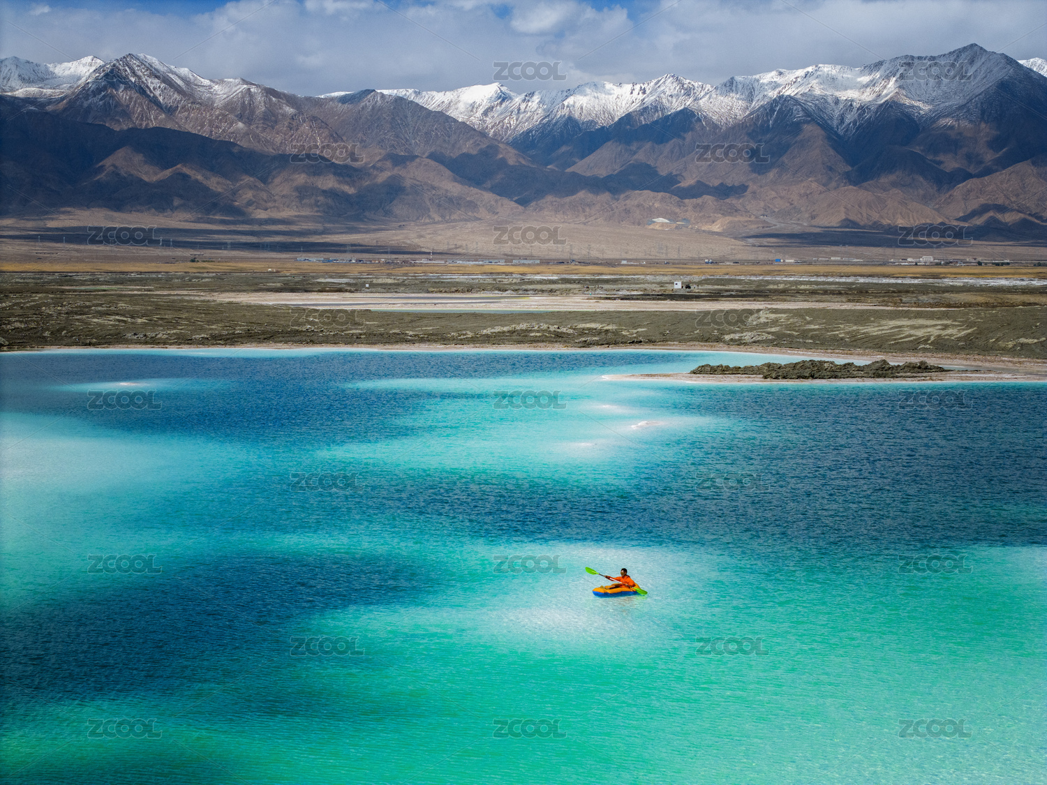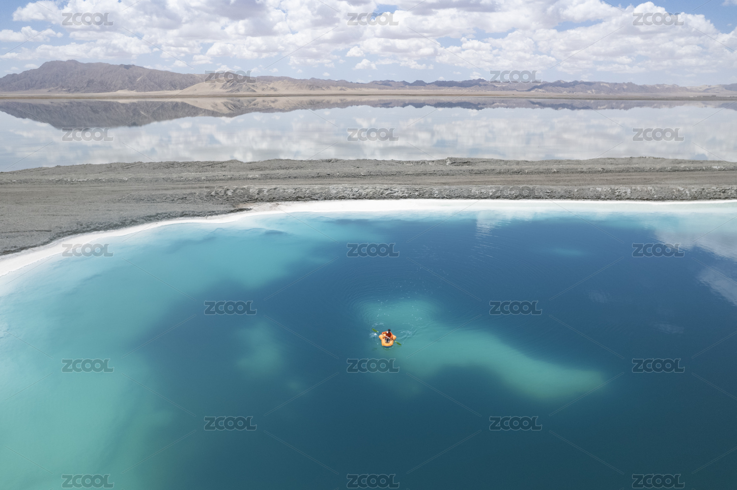 在青海大柴旦盐湖中划皮划艇的人