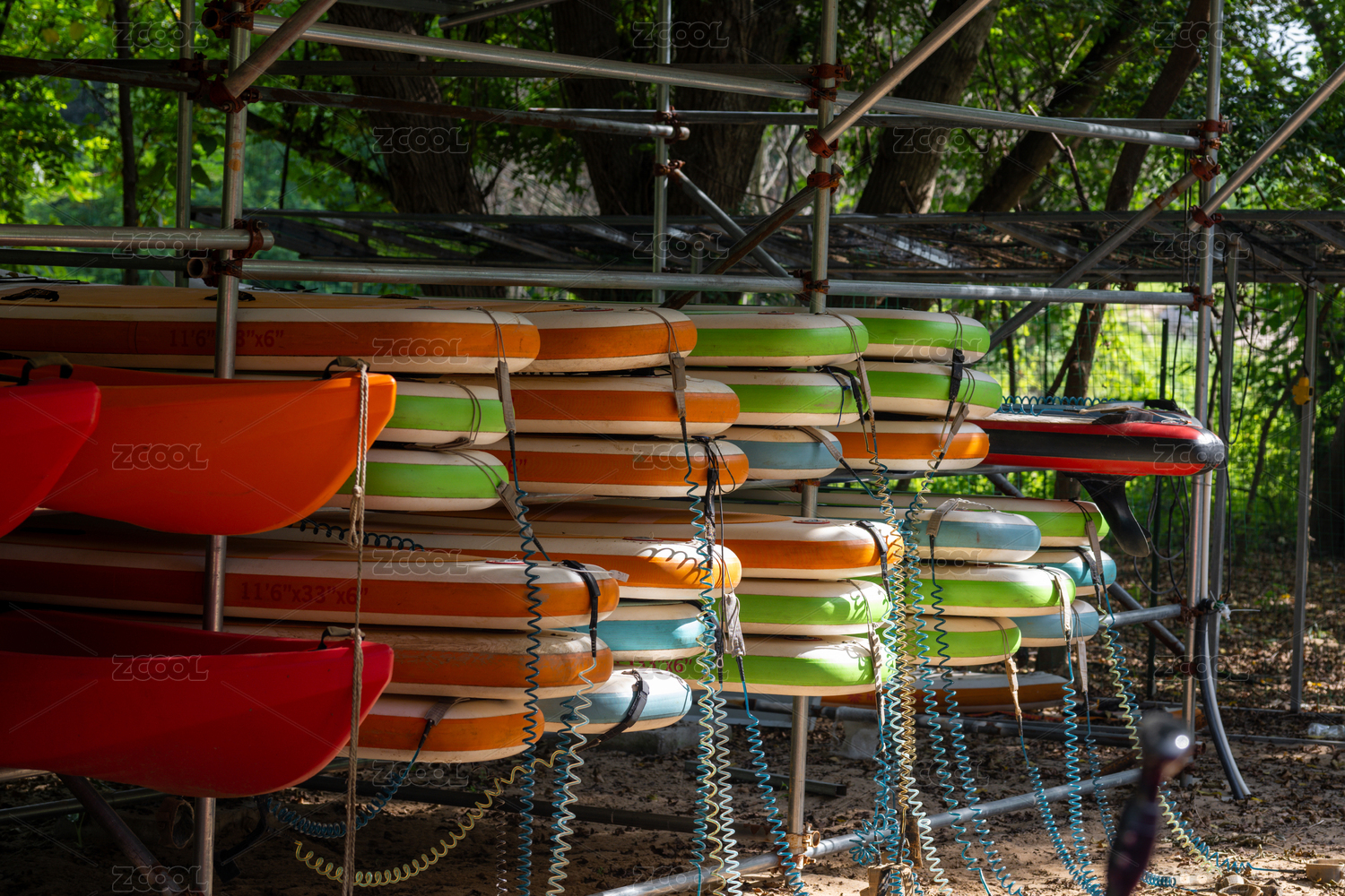 色彩斑斓的皮划艇整齐排列在遮阳棚下