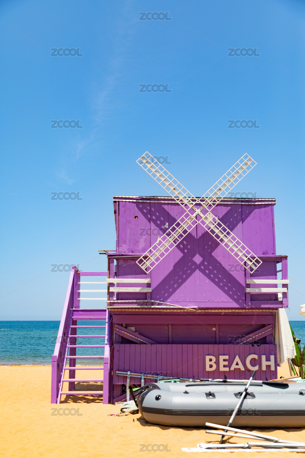 海边沙滩上的紫色小木屋和皮划艇