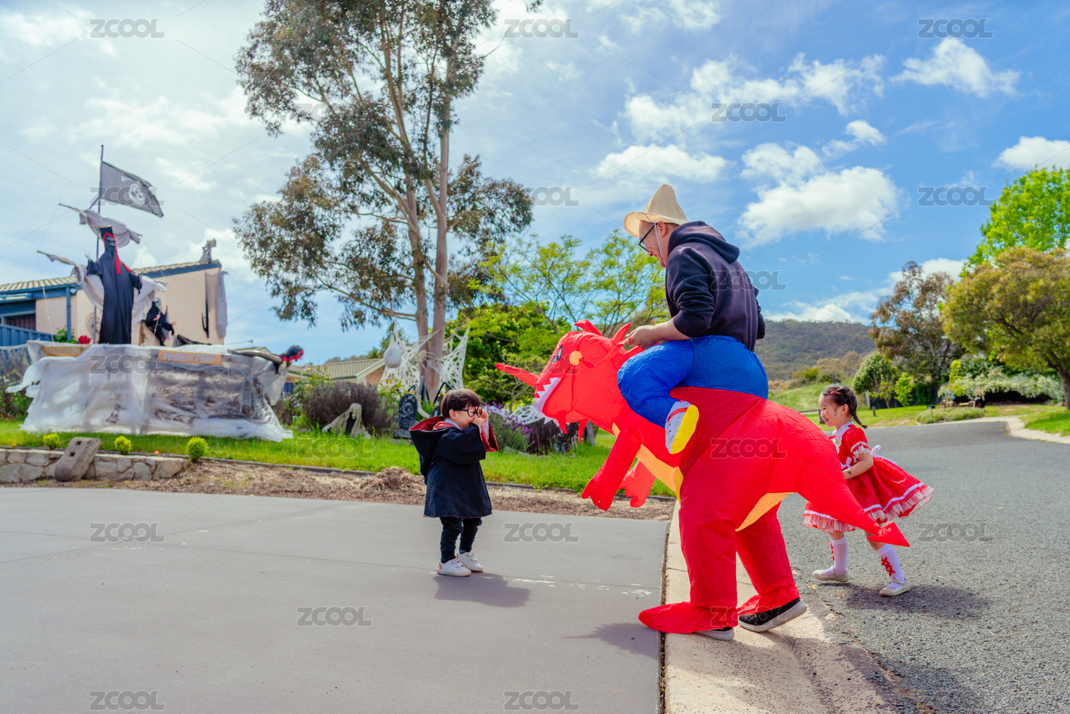 万圣节街道上骑恐龙快乐三个人