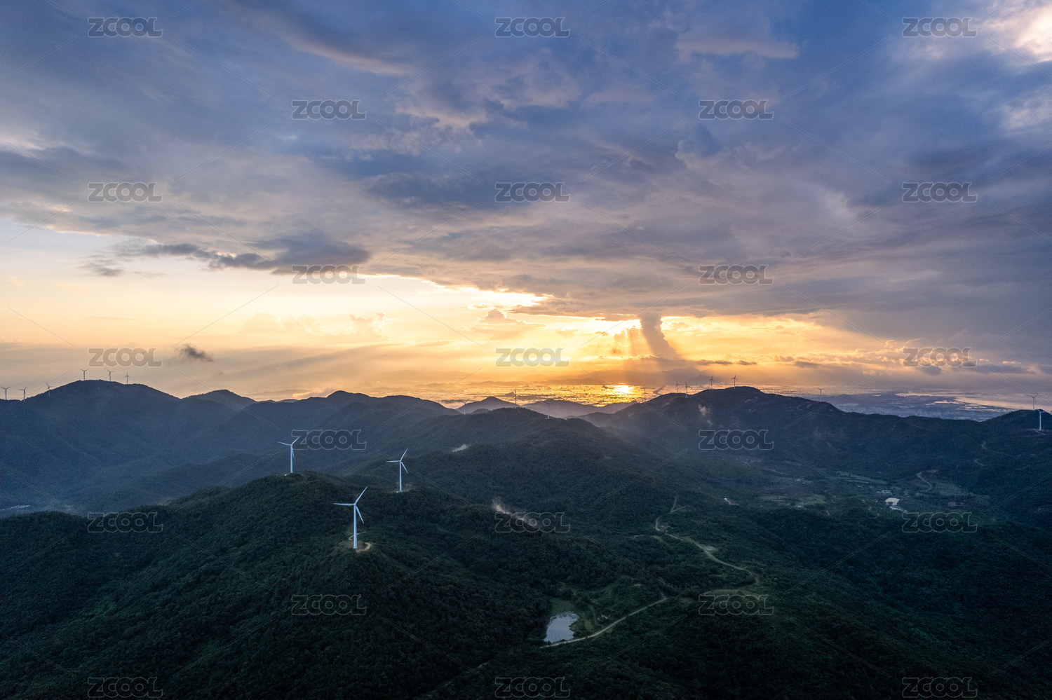 风力发电清洁能源日出山脉大气航拍
