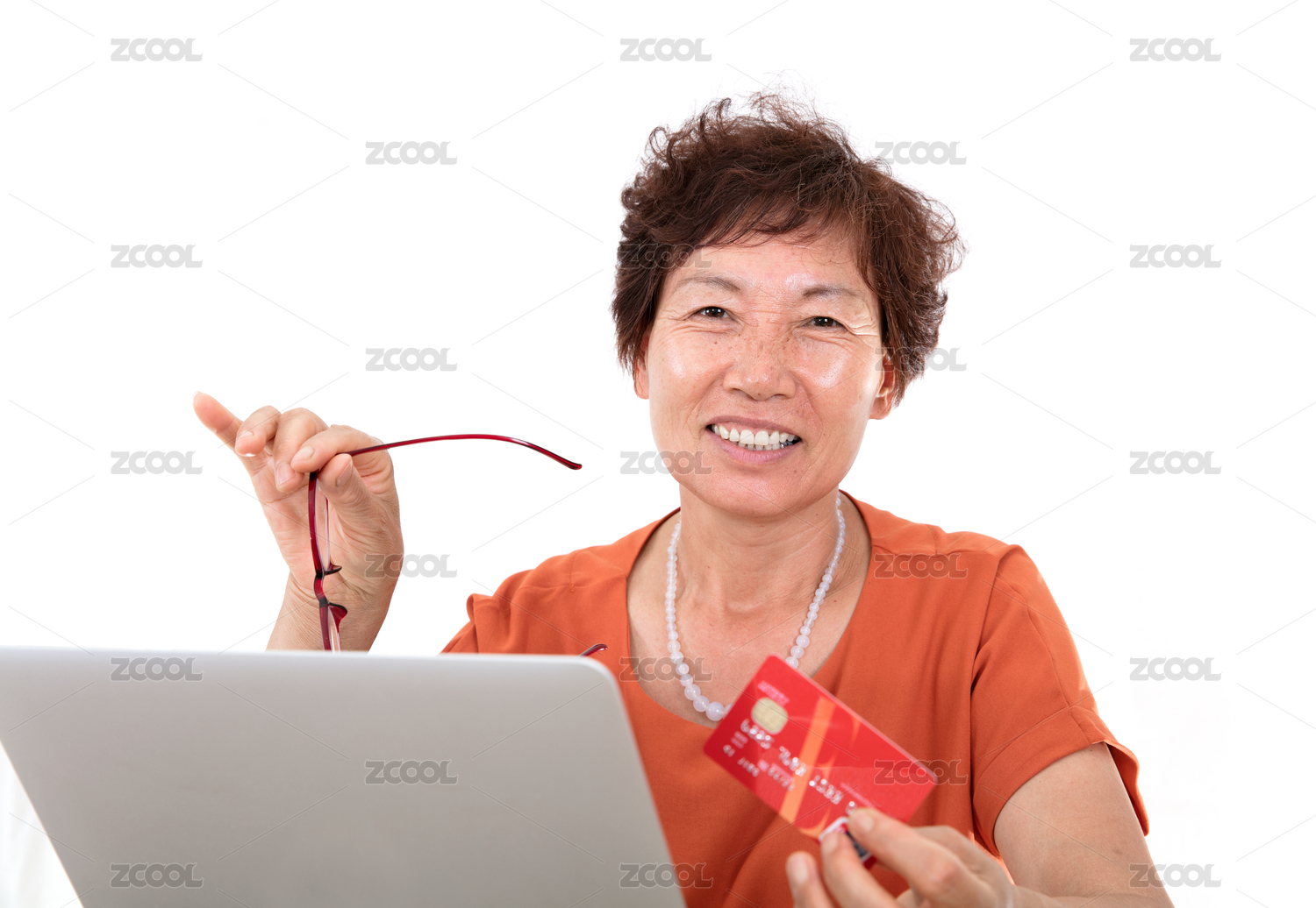 亚洲中年妇女在电脑前手拿眼镜和银行卡笑着看着镜头