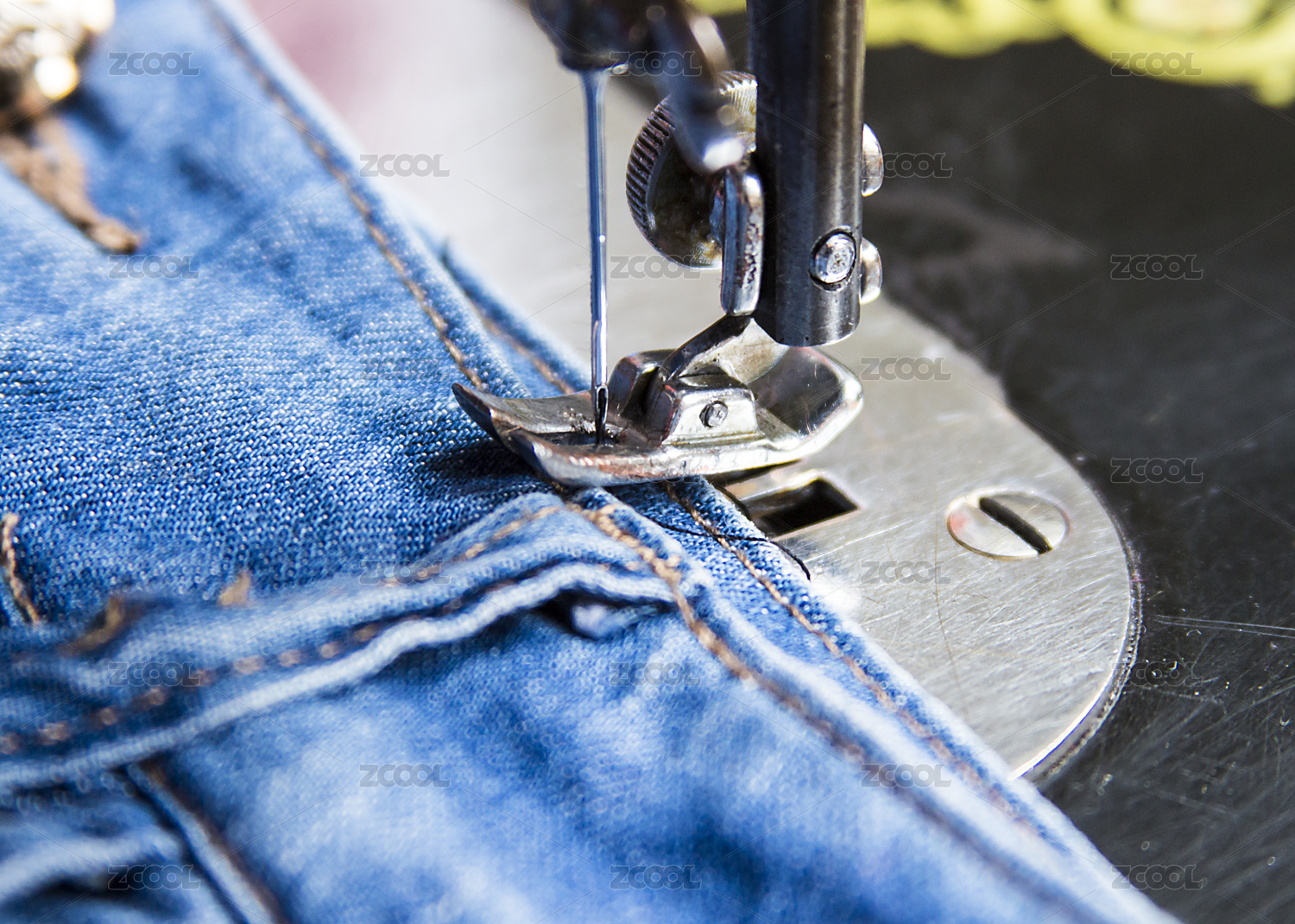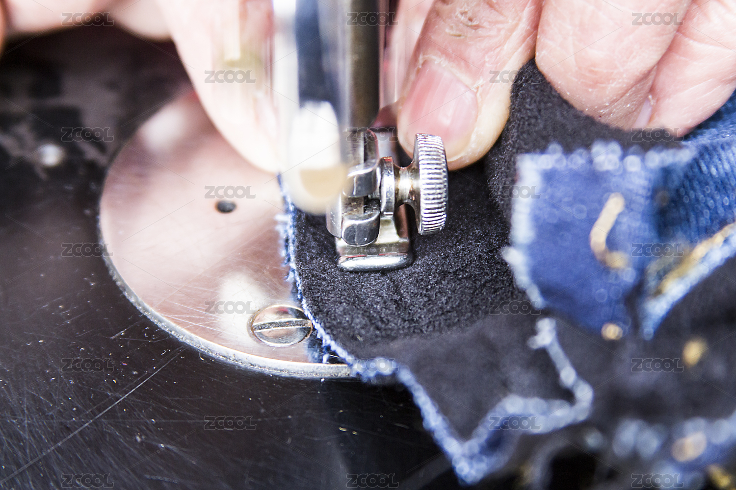 使用传统缝纫机修补牛仔裤特写镜头