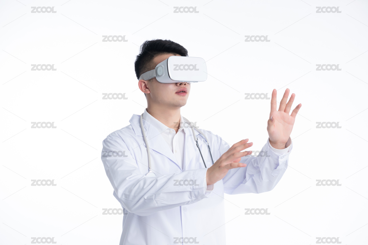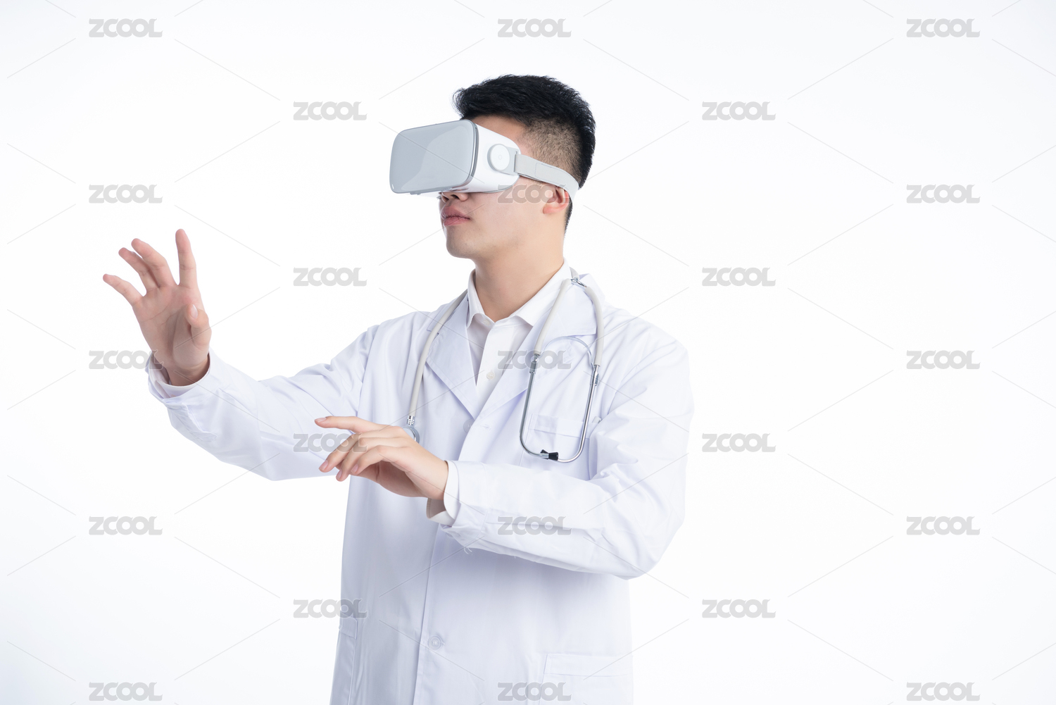优雅的吸引力医生戴VR设备时,使用移动电脑通过在线服务系统的工作,她在医疗3D视频看。