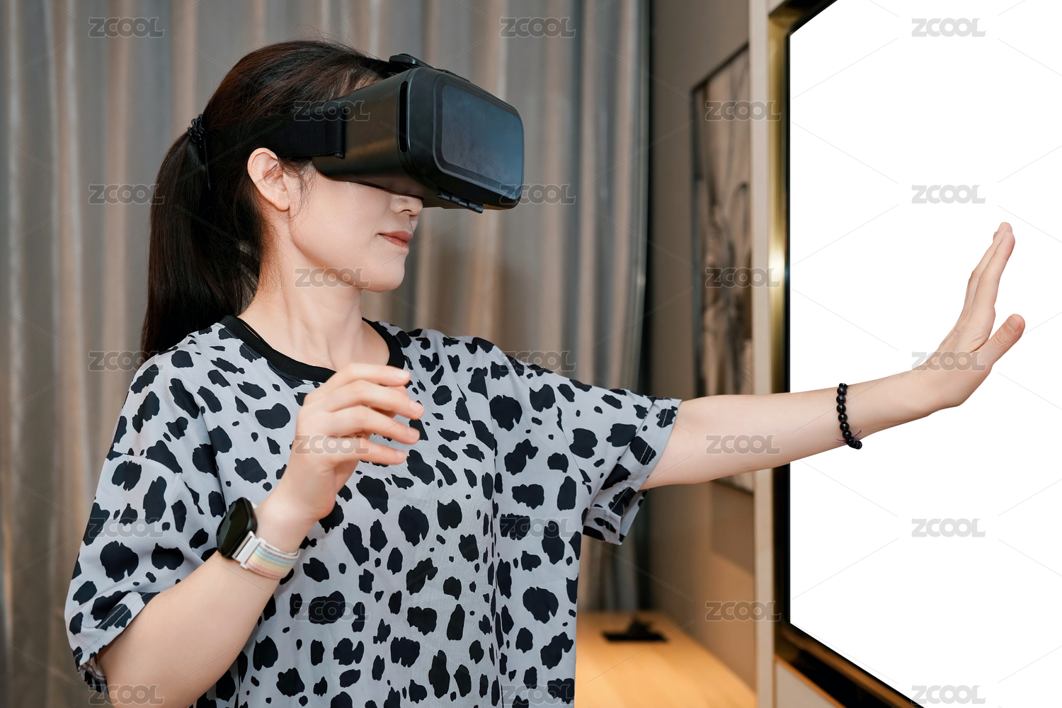 中国的亚洲女孩上班族在3D视觉感到惊讶VR设备,因为震撼而在现代办公工作室的办公桌屏幕立体效果。