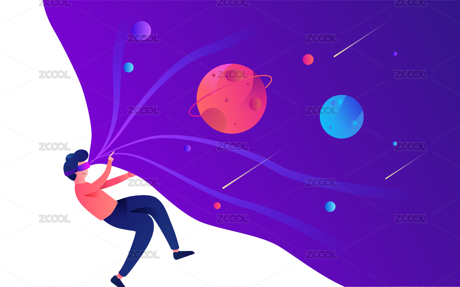 年轻漂亮的女孩穿着服饰制衣观看VR设备3D图像视频和站在蓝色背景的感觉太可怕了。