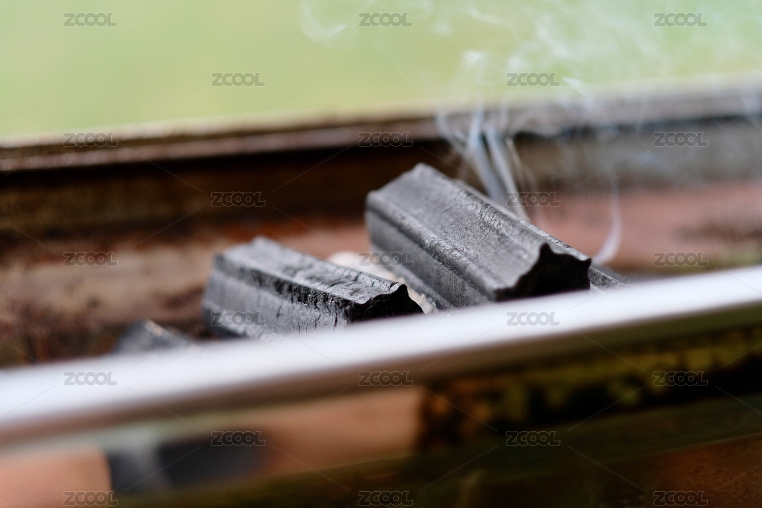 炉子里的黑色烧烤炭冒出青烟