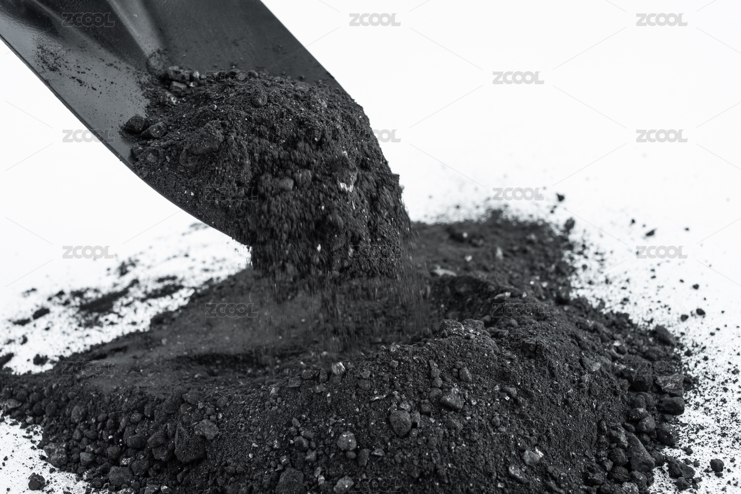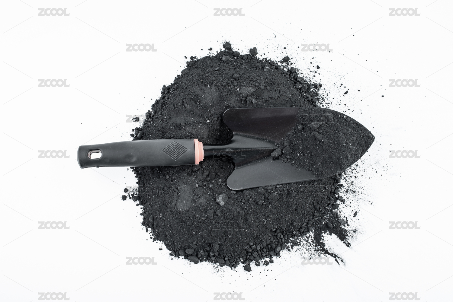白背景上一堆煤炭和铁锹