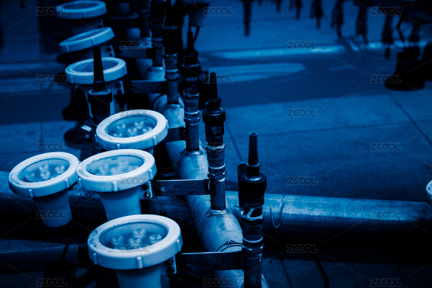 消防工程喷头的特写镜头焦点在蓝色调的喷泉。